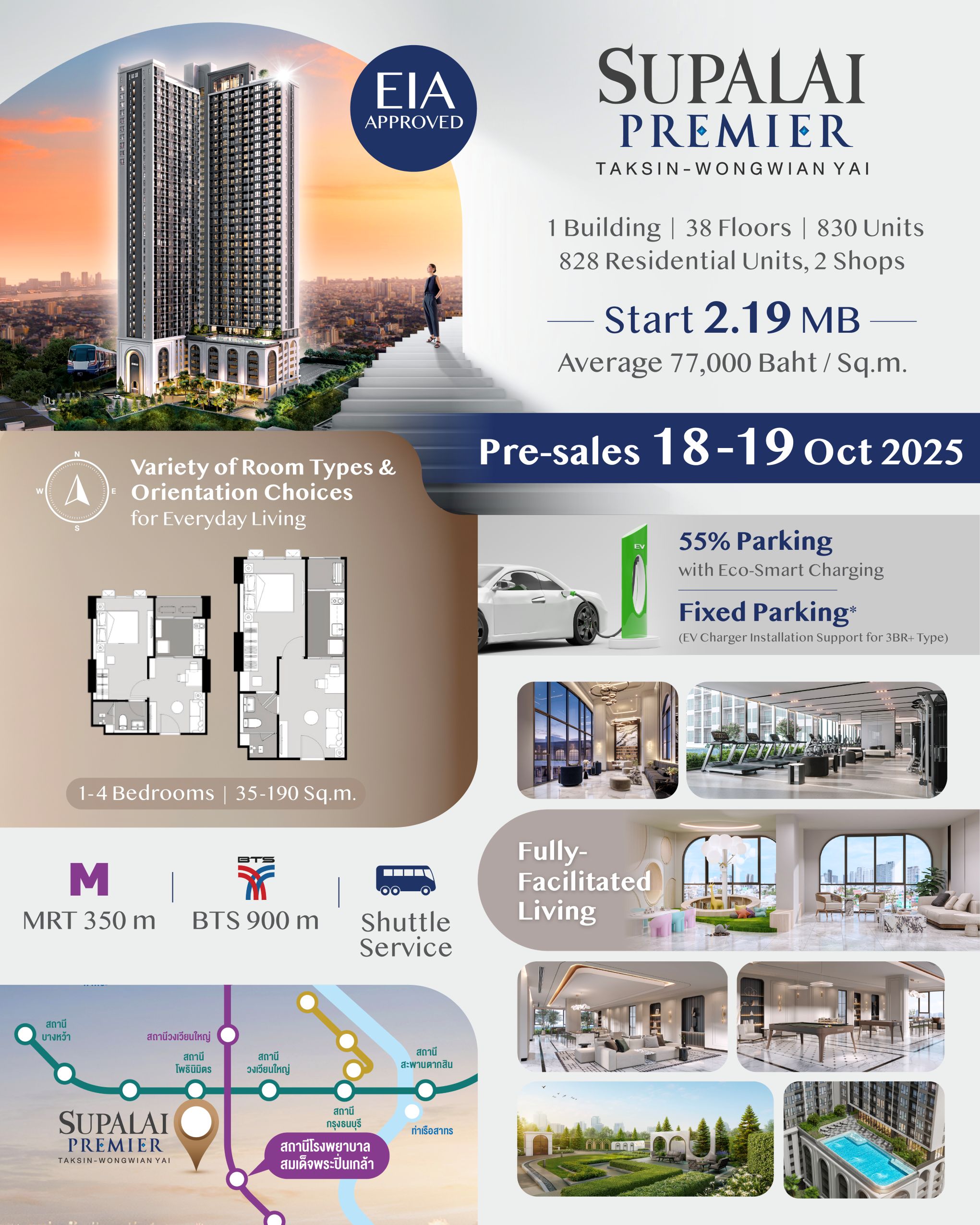 อีกทั้งโครงการนี้ผ่านการพิจารณาการประเมินผลกระทบสิ่งแวดล้อม (EIA) เป็นที่เรียบร้อย สะท้อนถึงความใส่ใจในคุณภาพชีวิตของผู้อยู่อาศัยในระยะยาว ควบคู่ไปกับความรับผิดชอบต่อสิ่งแวดล้อมและบริบทของชุมชนโดยรอบ เพราะทำเลที่ใช่...คือจุดเริ่มต้นของชีวิตสมบูรณ์แบบที่ ศุภาลัย พรีเมียร์ ตากสิน-วงเวียนใหญ่ ในราคา 2.19-18 ล้านบาท ลงทะเบียนพร้อมรับข้อเสนอสุดพิเศษก่อนใคร https://shorturl.asia/DTJlz กำหนดเปิดตัว Pre-Sales วันที่ 18-19 ตุลาคม 2568 นี้ และสามารถชมห้องตัวอย่างได้แล้ว ณ สำนักงานขายโครงการ ถนนสมเด็จพระเจ้าตากสิน สอบถามข้อมูลเพิ่มเติมโทร.1720 หรือติดตามข้อมูลและข่าวสารเพิ่มเติมของโครงการได้ที่ www.supalai.com และ Facebook: Supalai