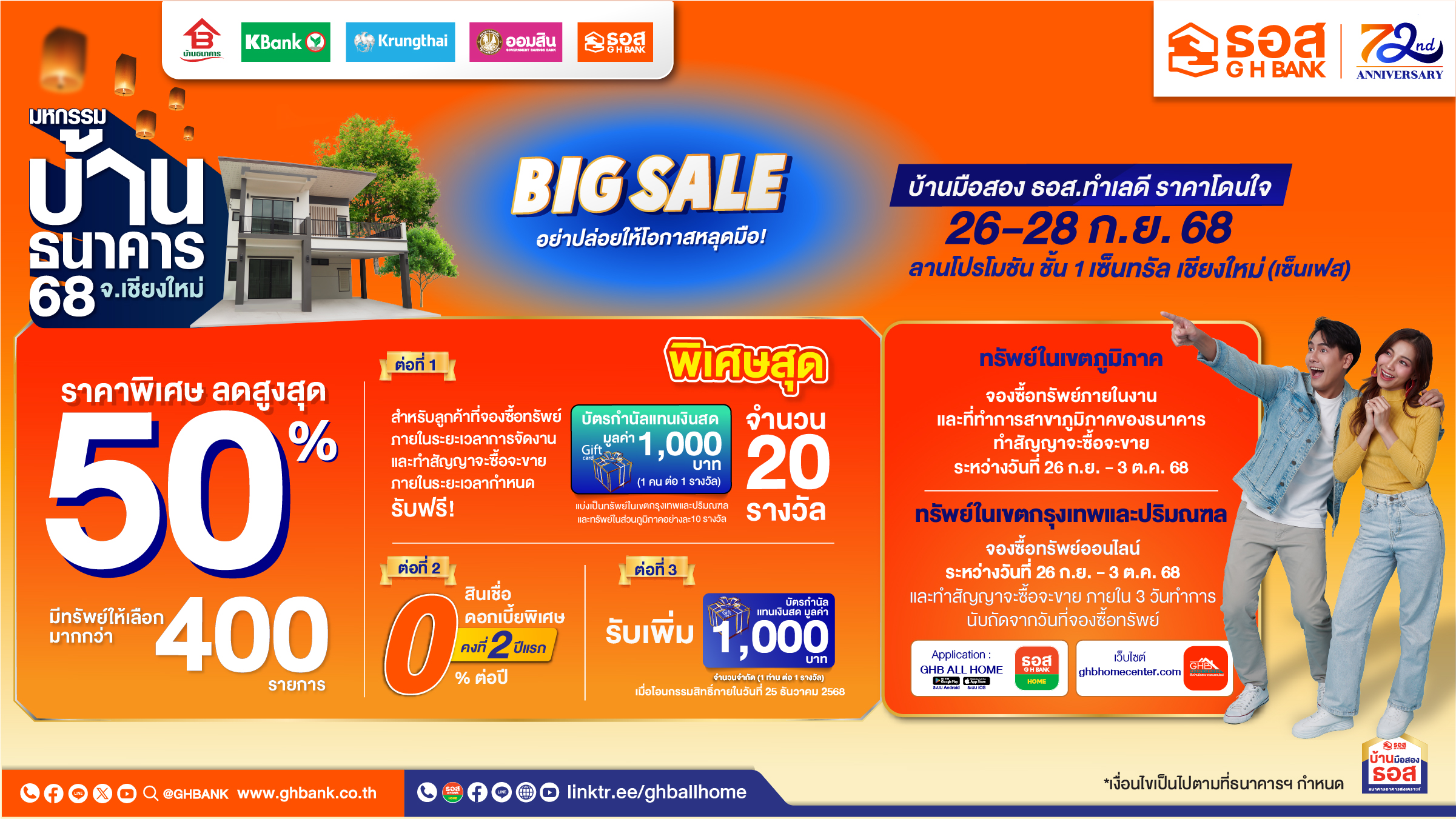 - ต่อที่ 3 ลูกค้าที่จองซื้อทรัพย์และโอนกรรมสิทธิ์ภายในวันที่ 25 ธันวาคม 2568 รับเพิ่มบัตรกำนัลแทนเงินสดมูลค่า 1,000 บาท (1 ท่านต่อ 1 รางวัล) สำหรับผู้ที่สนใจสามารถดูทรัพย์จริงก่อนจองซื้อออนไลน์ได้ที่ Application : GHB ALL HOME หรือ www.ghbhomecenter.com โดยสอบถามข้อมูลเพิ่มเติมได้ที่