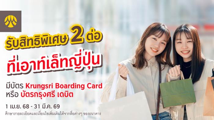 กรุงเทพฯ, 26 กันยายน 2568 : กรุงศรี (ธนาคารกรุงศรีอยุธยา จำกัด (มหาชน)) ชวนลูกค้าบัตร Krungsri Boarding Card และบัตรกรุงศรี เดบิต ช้อปสุดคุ้มที่เอาท์เล็ทกว่า 20 สาขาทั่วญี่ปุ่น เพียงแสดง QR code พร้อมบัตรที่เคาน์เตอร์ประชาสัมพันธ์ เพื่อรับสมุดคูปองส่วนลดและ Shopping Voucher และใช้จ่ายผ่านบัตร Krungsri Boarding Card หรือบัตรกรุงศรี เดบิต ณ ร้านค้าที่ร่วมรายการภายในเอาท์เล็ท ตั้งแต่ 1 เมษายน 2568 – 31 มีนาคม 2569 รับสิทธิพิเศษ 2 ต่อดังนี้