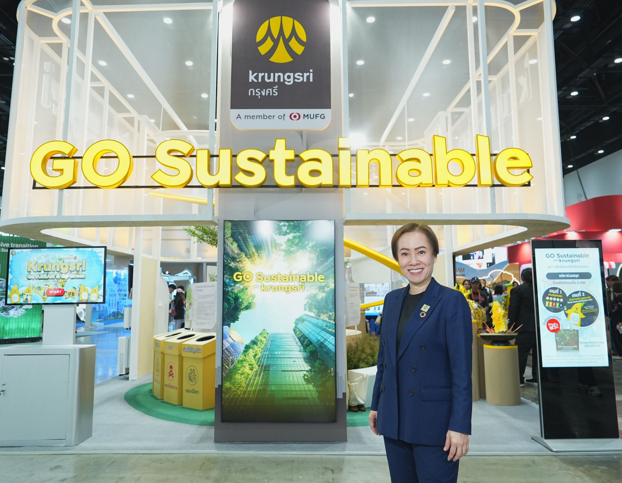 ปีนี้กรุงศรีนำเสนอพื้นที่จัดแสดงภายใต้แนวคิด “GO Sustainable with krungsri” ที่ออกแบบอย่างใส่ใจสิ่งแวดล้อม โดยการนำโครงสร้างบางส่วนจากงานเดิมกลับมาใช้ซ้ำ (Reuse) และเลือกใช้วัสดุที่เป็นมิตรต่อสิ่งแวดล้อม ถ่ายทอดแนวคิด “หลักคิด–หลักปฏิบัติ” ด้านความยั่งยืนของธนาคารและบริษัทในเครือในมิติที่จับต้องได้ ภายในบูธผู้เข้าชมจะได้พบกับกิจกรรมอินเตอร์แอคทีฟที่ทั้งสนุกและให้ความรู้ ไม่ว่าจะเป็น เกมแยกขยะ เสริมทักษะการจัดการของเสียอย่างถูกวิธี โซนถ่ายภาพ–แชร์โซเชียล พร้อมรับของที่ระลึก Krungsri Reusable Bag รวมถึง นิทรรศการที่นำเสนอผลงานชนะเลิศจาก From Waste to Wow Sustainable Sculpture Contest 2025 by Krungsri ศิลปะสร้างสรรค์จากวัสดุรีไซเคิลที่สะท้อนพลังความคิดใหม่ของเยาวชน