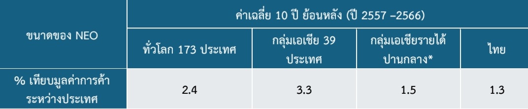 โดยปรับลดลงมากว่าครึ่งจาก 15.2 พันล้านดอลลาร์สหรัฐฯ โดยสัดส่วน NEO ต่อมูลค่าการค้าระหว่างประเทศของไทย ในปี 2567 อยู่ที่ 1% ซึ่งน้อยกว่าค่าเฉลี่ยย้อนหลัง 10 ปี ที่ 1.3% และน้อยกว่าค่าเฉลี่ยของประเทศทั่วโลกที่ประมาณ 2.4%