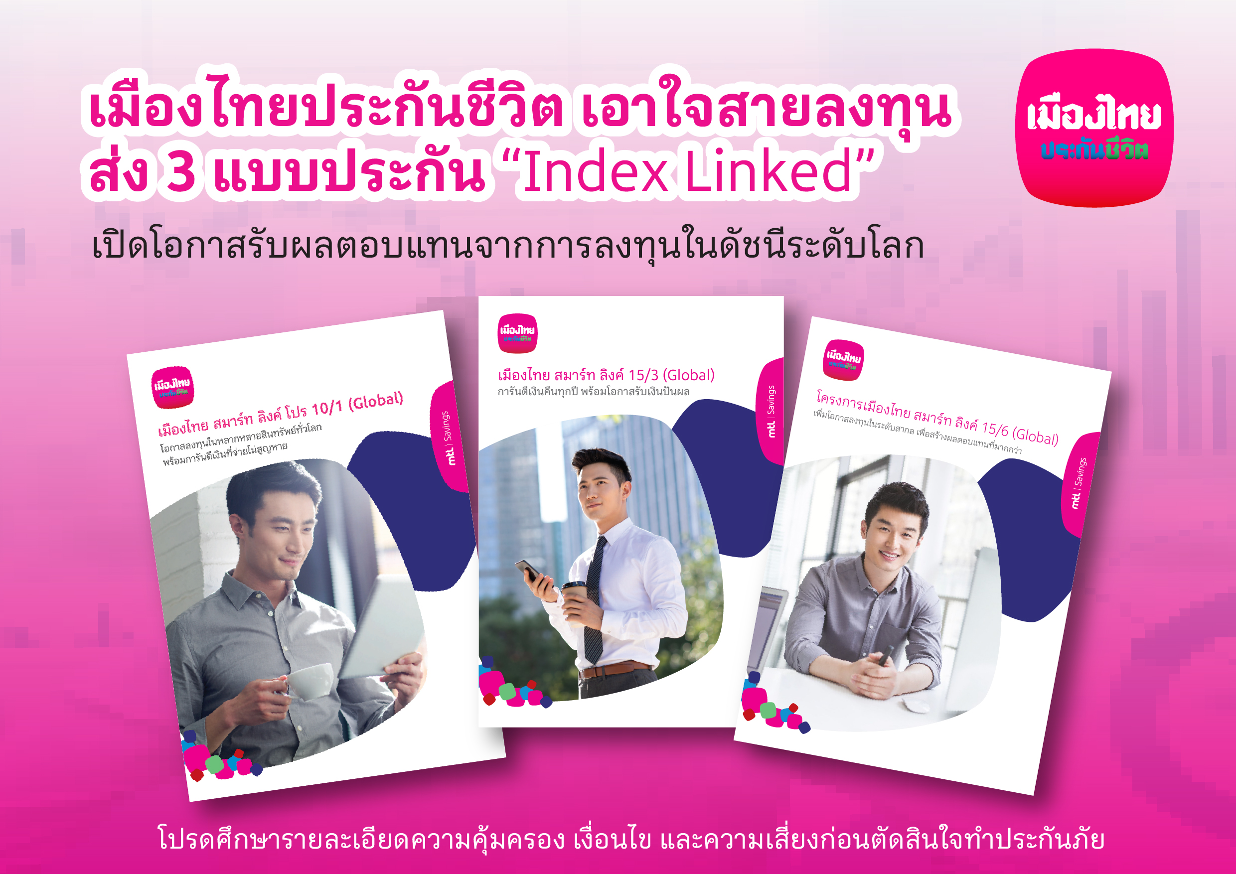 ด้าน “เมืองไทย สมาร์ท ลิงค์ 15/3 (Global)” ให้คุณได้ลงทุนด้วยประกันออมทรัพย์ ผ่านผู้ช่วยบริหารการลงทุน พร้อมเพิ่มโอกาสรับผลตอบแทนจากการลงทุนส่วนเพิ่ม (Upside gain) ผ่านดัชนี GS Momentum Builder® Multi-Asset 5S ER พัฒนาและบริหารจัดการโดย Goldman Sachs ซึ่งเป็นหนึ่งในสถาบันการเงินชั้นนำระดับโลก เปิดโอกาสจากการลงทุนในหลายประเทศทั่วโลกและกระจายการลงทุนไปยังสินทรัพย์หลากหลายประเภท การันตีเงินคืนทุกปีๆ ละ 1%* พร้อมโอกาสรับผลตอบแทนจากการลงทุนในรูปแบบของเงินปันผล จ่ายเบี้ยสั้นเพียง 3 ปี แต่ให้ความคุ้มครองชีวิตนานถึง 15 ปี เบี้ยประกันภัยเริ่มต้นปีละ 20,000 บาท