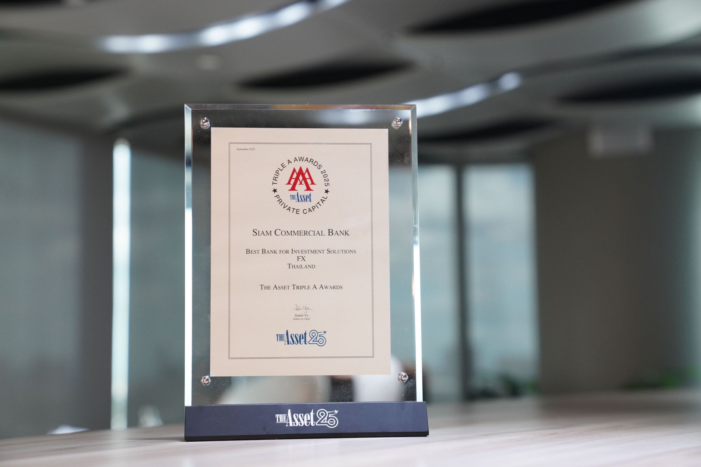 30 กันยายน 2568 : ธนาคารไทยพาณิชย์ คว้ารางวัลธนาคารยอดเยี่ยมเพื่อการลงทุน “Thailand Best Bank for Investment Solutions, FX” จากเวที The Asset Triple A Awards เป็นปีที่ 2 ติดต่อกัน ด้วยการเป็นธนาคารที่มีบทบาทโดดเด่นในการนำเสนอผลิตภัณฑ์เพื่อเพิ่มผลตอบแทน (Yield Enhancement) ผ่านหุ้นกู้ที่มีอนุพันธ์แฝงที่เป็นสกุลเงินบาท ประเภท Dual Currency ตอบโจทย์ความต้องการลงทุนต่างประเทศของนักลงทุนที่มีความมั่งคั่งสูง (High Net Worth) โดยมี แพททริก ปูเลีย รองผู้จัดการใหญ่ ผู้บริหารสายงาน Financial Markets และ ศรชัย สุเนต์ตา รองผู้จัดการใหญ่ ผู้บริหารสายงาน Wealth & Investment Product ร่วมประกาศความสำเร็จครั้งนี้