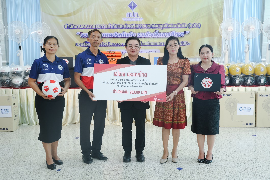 นอกจากนี้ สุวิรัช พงศ์เสาวภาคย์ (กลาง) ผู้อำนวยการฝ่ายกิจการภายนอก เป็นผู้แทนเอไอเอ ประเทศไทย มอบทุนการศึกษาจำนวน 20,000 บาท ลูกฟุตบอล 5 ลูก และแล็ปท็อป 10 เครื่อง โดยมี โชคอนันต์ นาคสงวน (ที่ 2 จากซ้าย) ผู้อำนวยการโรงเรียนเทศบาลวัดธรรมนิมิต และ ณัฏฐ์วิภา สุริยันต์ (ที่ 2 จากขวา) รองผู้อำนวยการกลุ่มบริหารงานบุคคล โรงเรียนถาวรานุกูล เป็นผู้รับมอบ ผ่านกิจกรรม “สำนักงาน คปภ. รวมพลังภาคประกันภัย รวมใจเพื่อการศึกษาให้กับโรงเรียนภายใต้การอุปถัมภ์ของวัดธรรมนิมิต” เพื่อส่งเสริมด้านการศึกษาแก่เด็กนักเรียนของโรงเรียนในพระอุปถัมภ์ของวัดธรรมนิมิตทั้ง 2 แห่ง ซึ่งกิจกรรมครั้งนี้สะท้อนถึงความมุ่งมั่นของเอไอเอ ประเทศไทย ในการมีส่วนร่วมกับสังคมและชุมชน ผ่านการสนับสนุนกิจกรรมทางศาสนาและวัฒนธรรม ตลอดจนส่งเสริมด้านการศึกษาของเยาวชนไทย สอดคล้องกับพันธกิจที่มุ่งมั่นในการสนับสนุนให้คนไทยและเยาวชนมีสุขภาพและชีวิตที่ดีขึ้น ตามคำมั่นสัญญา ‘Healthier, Longer, Better Lives’