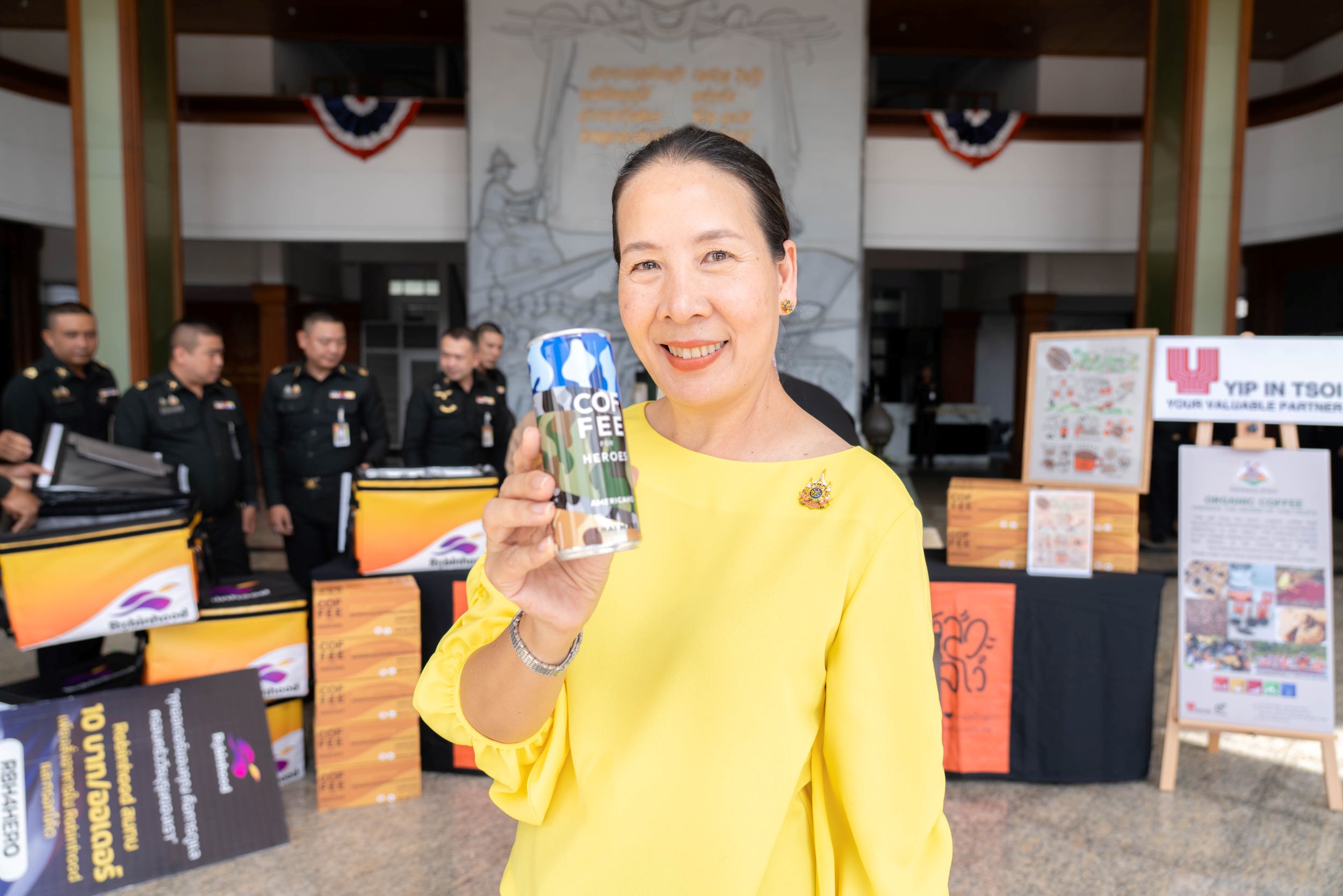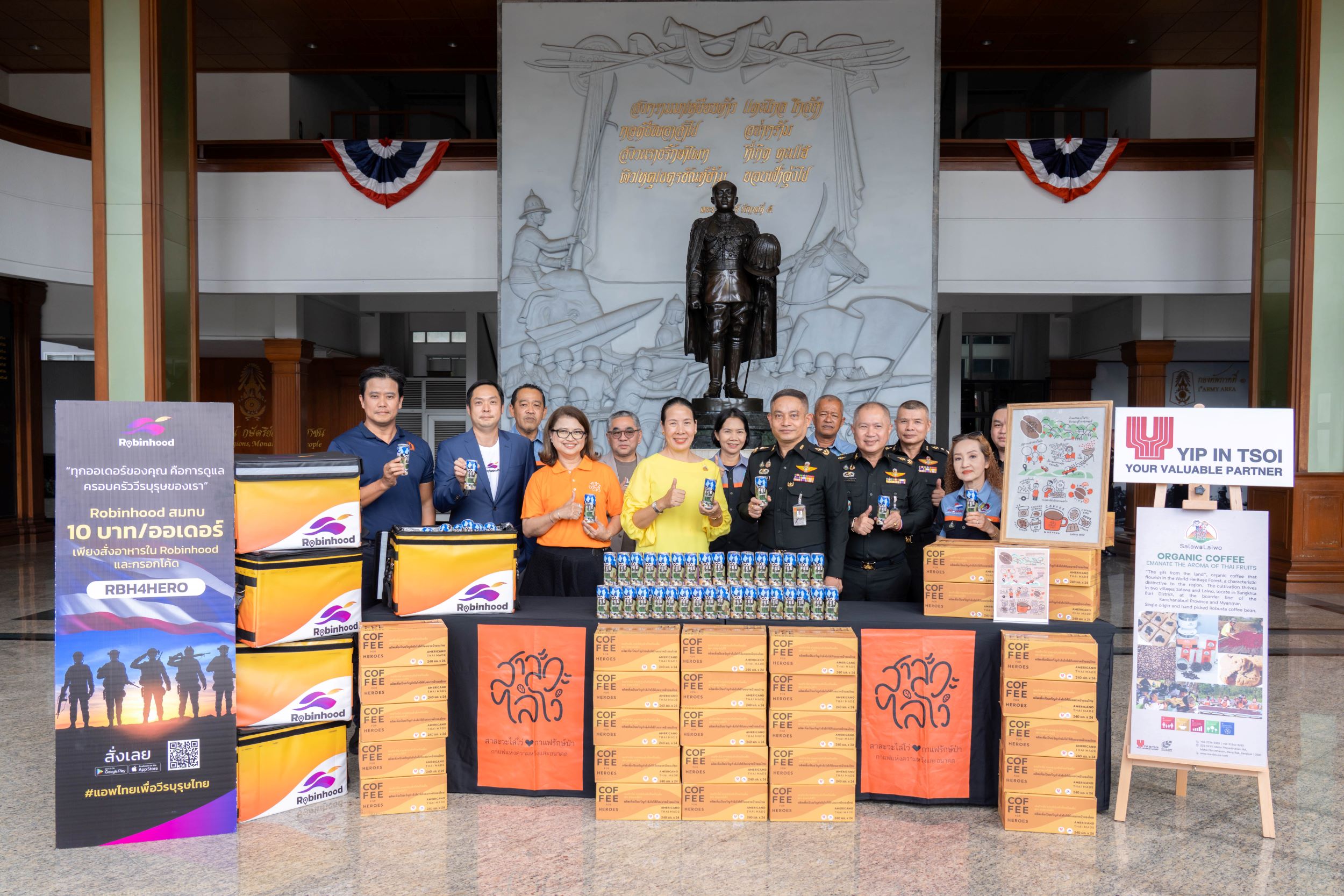 2 ตุลาคม 2568 : คุณมรกต ยิบอินซอย กรรมการผู้จัดการใหญ่และประธานเจ้าหน้าที่บริหาร (ที่ 3 จากซ้าย) คุณแววรัตน์ ชำนาญภักดี ผู้อำนวยการสายงานทรัพยากรบุคคลและสื่อสารองค์กร (ที่ 2 จากซ้าย) บริษัท ยิบอินซอย จำกัด พร้อมทั้งผู้บริหาร คุณพงศ์ปณต อิงคสิทธิ์ ประธานเจ้าหน้าที่บริหารฝ่ายธุรกิจ Chief Commercial Officer (CCO) (ซ้ายสุด) โรบินฮู้ด เดลิเวอรี่ มอบกาแฟกระป๋องพร้อมดื่ม “กาแฟรักษ์ป่า” สาละวะไล่โว่ ซึ่งเป็นโครงการอันเนื่องมาจากพระราชดำริในรัชกาลที่ 9 “โครงการพัฒนาชุมชนโดยมูลนิธิภูบดินทร์” โดยมี พล.ต.สุรวิชญ์ แดงจันทร์ เสนาธิการกองทัพภาคที่ 1 (ขวาสุด) และ พล.ต.พิพัฒน์ จงวัฒนาไพศาล ผู้อำนวยการสำนักกิจการพลเรือน กรมกิจการพลเรือนทหารบก (ผอ.สกร.กร.ทบ.) (ที่ 2 จากขวา) เป็นผู้รับมอบ ณ กองบัญชาการกองทัพภาคที่ 1