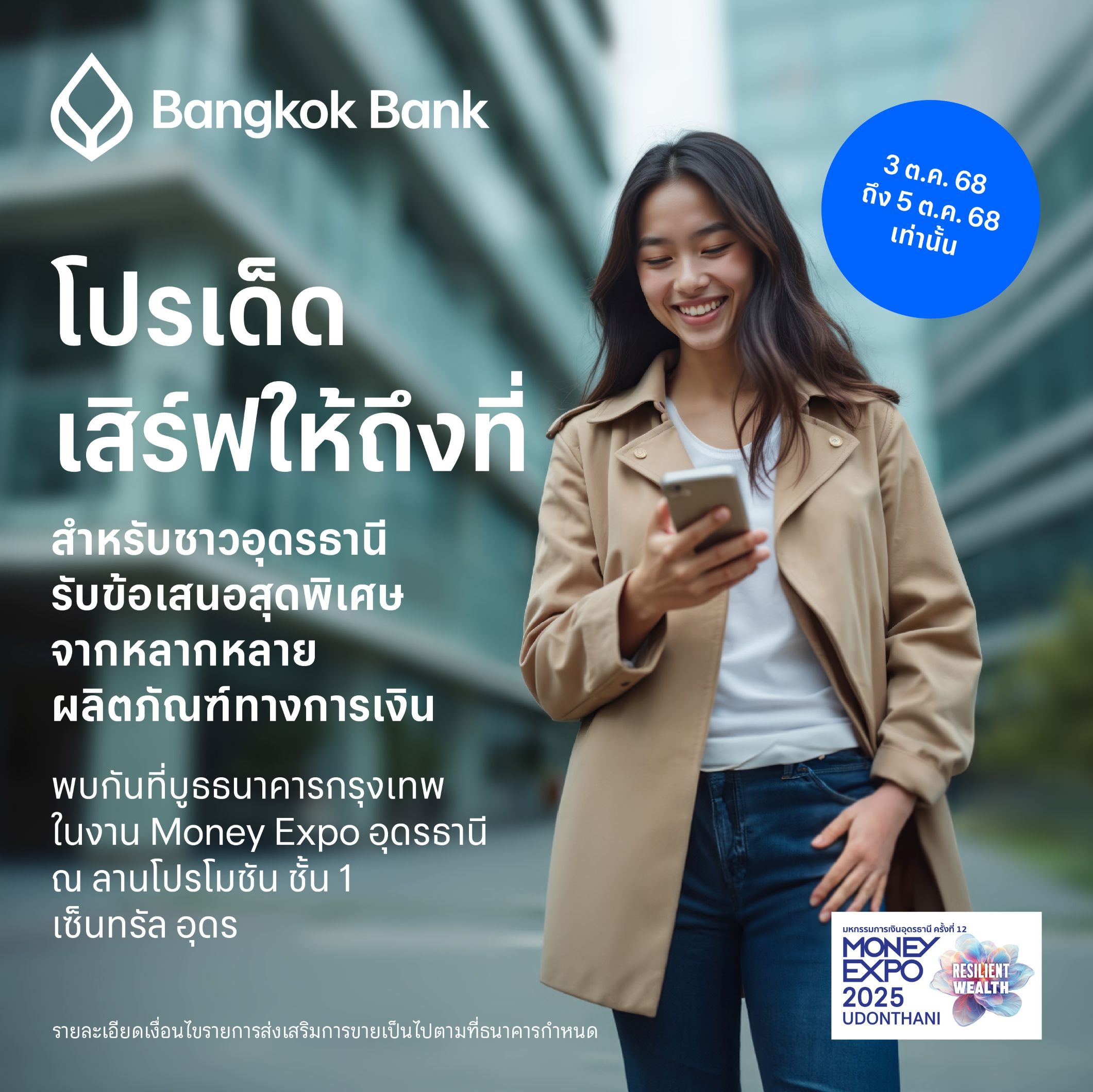 ทั้งนี้ ธนาคารได้จัดทีมเจ้าหน้าที่ผู้เชี่ยวชาญเพื่อให้คำปรึกษาเฉพาะบุคคล ในการช่วยให้ลูกค้าสามารถวางแผนทางการเงินที่เหมาะสมกับเป้าหมายและรูปแบบการใช้ชีวิตในแต่ละช่วงวัยได้อย่างมั่นใจ ตอกย้ำบทบาทความเป็น “เพื่อนคู่คิด มิตรคู่บ้าน” เคียงข้างทุกเรื่องการเงิน โดยผู้ที่สนใจสามารถขอรับคำปรึกษาด้านการเงิน การลงทุน ตลอดจนสมัครบริการต่างๆ ที่มาพร้อมกับโปรโมชันพิเศษ ได้ที่บูธธนาคารกรุงเทพ ในงานมหกรรมการเงินอุดรธานี ครั้งที่ 12 (Money Expo Udonthani 2025) ระหว่างวันที่ 3 – 5 ตุลาคม 2568 ณ ลานโปรโมชัน ชั้น 1 ศูนย์การค้าเซ็นทรัล อุดรธานี
