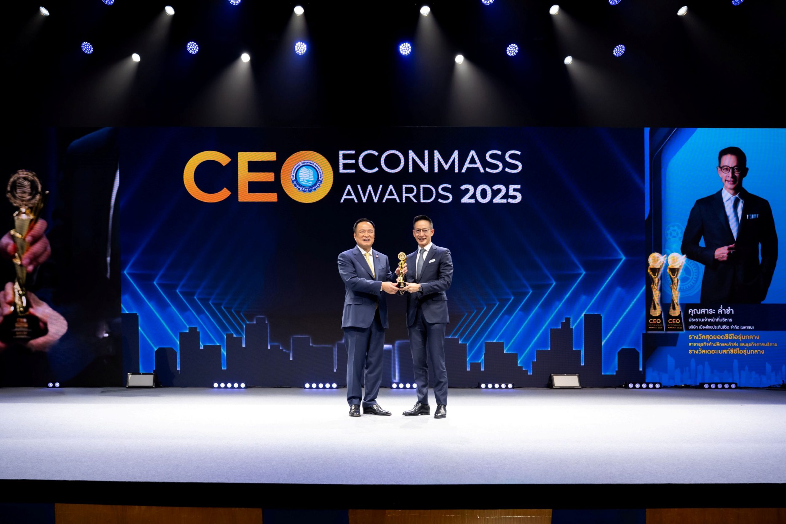 8 ตุลาคม 2568 : นายสาระ ล่ำซำ ประธานเจ้าหน้าที่บริหาร บริษัท เมืองไทยประกันชีวิต จำกัด (มหาชน) เข้ารับ 2 รางวัลเกียรติยศสุดยอดผู้นำองค์กร ประจำปี 2568 ได้แก่ รางวัล “สุดยอดซีอีโอรุ่นกลาง” สาขาธุรกิจค้าปลีกและค้าส่ง และธุรกิจภาคบริการ และรางวัล “เดอะเบสท์ซีอีโอรุ่นกลาง” จากนายอนุทิน ชาญวีรกุล นายกรัฐมนตรีและรัฐมนตรีว่าการกระทรวงมหาดไทย ในงานมอบรางวัล CEO ECONMASS Awards 2025 ซึ่งจัดโดยสมาคมผู้สื่อข่าวเศรษฐกิจ ร่วมกับคณะกรรมการร่วมภาคเอกชน 3 สถาบัน (กกร.) สำนักงานคณะกรรมการนโยบายรัฐวิสาหกิจ (สคร.) และมหาวิทยาลัยหอการค้าไทย งานจัดขึ้น ณ โรงละครอักษรา คิง เพาเวอร์ กรุงเทพฯ