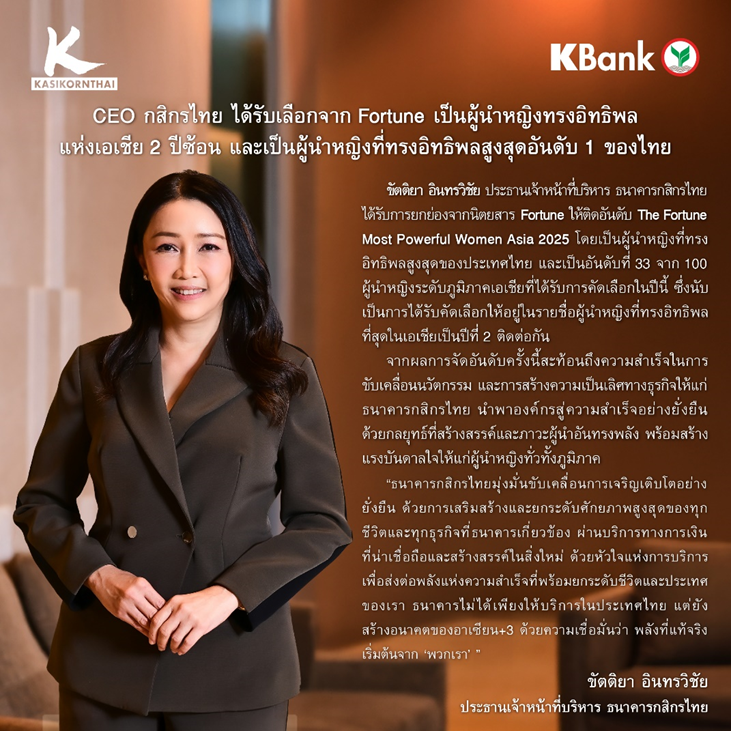 14 ตุลาคม 2568 : ขัตติยา อินทรวิชัย ประธานเจ้าหน้าที่บริหาร ธนาคารกสิกรไทย ได้รับการยกย่องจากนิตยสาร Fortune ให้ติดอันดับ The Fortune Most Powerful Women Asia 2025 โดยเป็นผู้นำหญิงที่ทรงอิทธิพลสูงสุดอันดับ 1 ของประเทศไทย และเป็นอันดับที่ 33 จาก 100 ผู้นำหญิงทรงอิทธิพลของภูมิภาคเอเชียที่ได้รับการคัดเลือกในปีนี้ ซึ่งเป็นการได้รับคัดเลือกให้อยู่ในรายชื่อผู้นำหญิงที่ทรงอิทธิพลที่สุดในเอเชียเป็นปีที่ 2 ติดต่อกัน