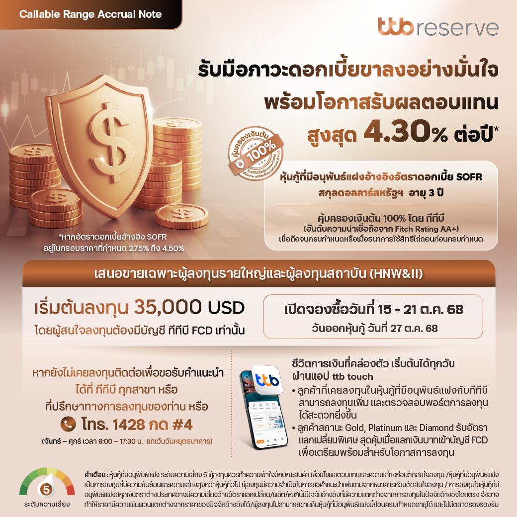 เสนอขายเฉพาะผู้ลงทุนรายใหญ่และผู้ลงทุนสถาบันเท่านั้น โดยสามารถลงทุนเริ่มต้นที่ 35,000 USD และเปิดจองซื้อตั้งแต่วันที่ 15 – 21 ตุลาคม 2568 เท่านั้น ศึกษารายละเอียดเพิ่มเติมได้ที่ https://www.ttbbank.com/link/pr/ttbreserve/stnrate