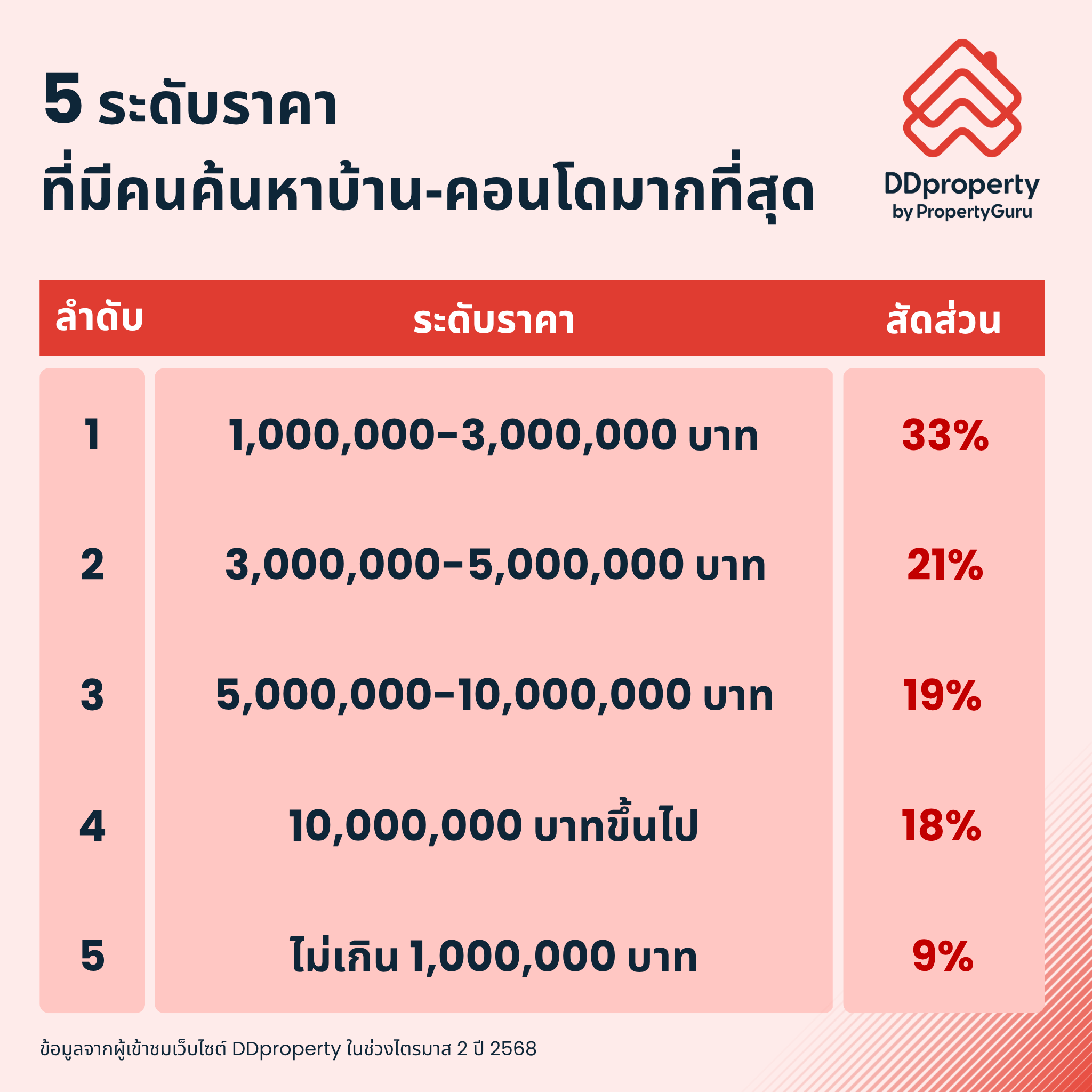 สอดคล้องกับข้อมูลจากผู้เข้าชมเว็บไซต์ DDproperty ในช่วงไตรมาส 2 ปี 2568 พบว่า ผู้เข้าชมเว็บไซต์มีความต้องการซื้อที่อยู่อาศัยไม่ว่าจะเป็นบ้านเดี่ยว ทาวน์โฮม และคอนโดฯ ในช่วงระดับราคา 1-3 ล้านบาทมากที่สุด โดยมีสัดส่วนมากถึง 33%
