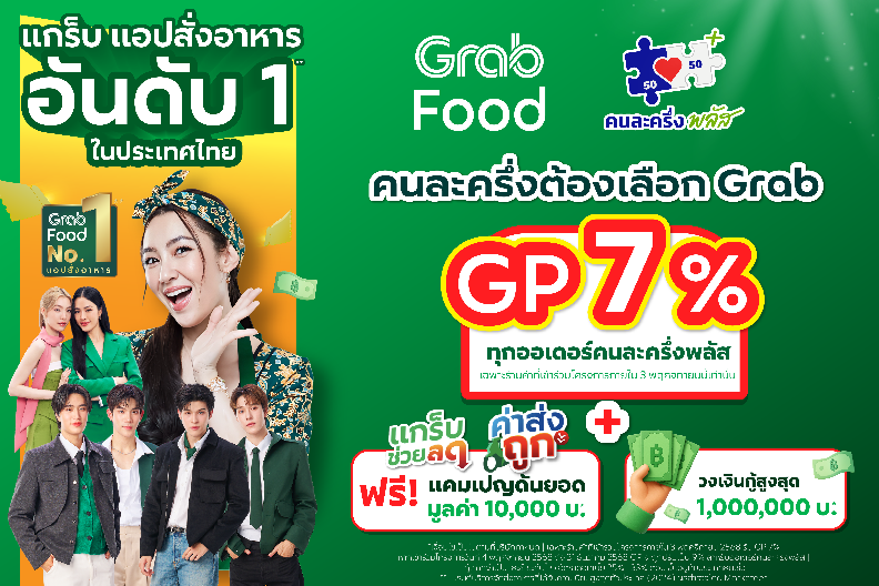 ** เงื่อนไขเป็นไปตามที่บริษัทฯ กำหนด ดูรายละเอียดเพิ่มเติมได้ที่ https://merchant.grab.com/th-th/blog/halfhalf25