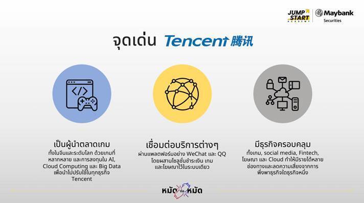 มาถึงคู่ท้าชิงฝั่งจีน แนะนำ Tencent บริษัทโฮลดิ้งที่ดำเนินธุรกิจหลักในจีน ก่อตั้งปี 1998 ให้บริการครอบคลุมหลายด้าน เป็นผู้นำตลาดเกมทั้งในจีนและระดับโลก มีการลงทุนในเทคโนโลยี AI, Cloud Computing และ Big Data เพื่อปรับใช้ในทุกธุรกิจ เชื่อมต่อบริการต่าง ๆ ผ่านแพลตฟอร์ม WeChat และ QQ ผสานระบบการชำระเงิน เกม และโฆษณาไว้ในระบบเดียว อีกทั้งยังมีธุรกิจครอบคลุมหลายด้าน (เกม, social media, Fintech, โฆษณา, Cloud) มีรายได้หลายช่องทาง ลดความเสี่ยงจากการพึ่งพาธุรกิจเดียว