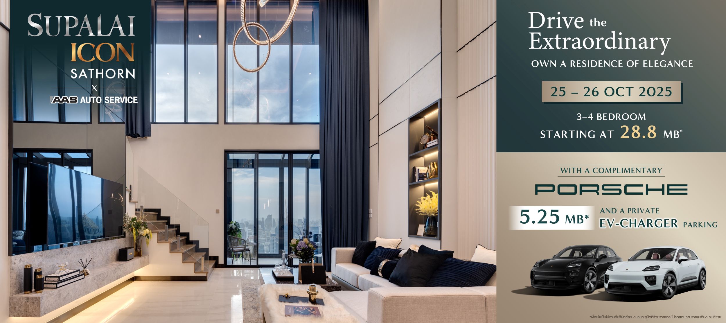 21 ตุลาคม 2568 : บมจ.ศุภาลัย ร่วมกับ AAS Auto Service จัดงาน “Drive the Extraordinary” ร่วมสัมผัสชีวิตเหนือระดับ กับคอนโดมิเนียม Supalai Icon Sathorn ลักซ์ชัวรีฟรีโฮลด์ใจกลางสาทร ขนาด 3-4 ห้องนอน ราคาเริ่มต้น 28.8 ล้านบาท* พร้อมสิทธิพิเศษเป็นเจ้าของ Porsche Macan Electric มูลค่า 5.25 ล้านบาท* สำหรับลูกค้าที่กำลังมองหาที่อยู่อาศัยระดับไฮเอนด์ โดดเด่นด้วยความหรูหราและเอกลักษณ์เฉพาะตัว พบกันในงานวันที่ 25-26 ตุลาคม 2568
