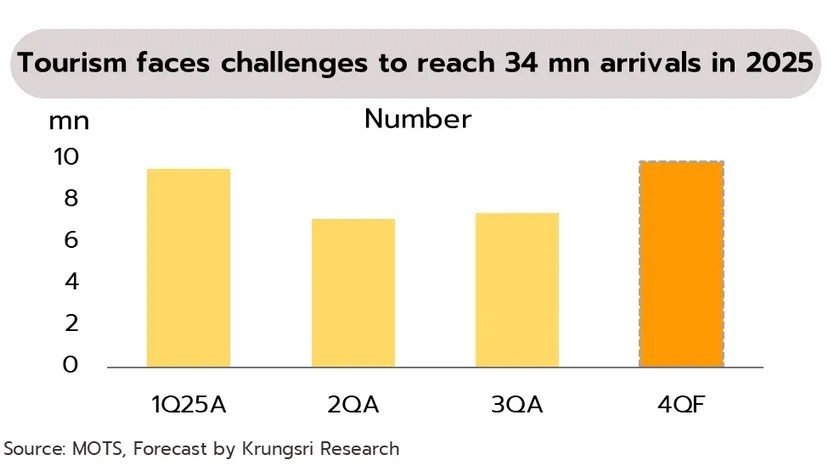 อย่างไรก็ตาม แม้มาตรการดังกล่าวอาจช่วยพยุงอุปสงค์ภายในประเทศและลดผลกระทบจากการชะลอตัวของนักท่องเที่ยวต่างชาติได้บางส่วน แต่วิจัยกรุงศรีประเมินว่า จำนวนนักท่องเที่ยวต่างชาติทั้งปี 2568 อาจต่ำกว่าที่เคยคาดการณ์ไว้ที่ 34 ล้านคน เนื่องจากการซบเซาของตลาดนักท่องเที่ยวจีน บวกกับการแข่งขันที่รุนแรงในตลาดภูมิภาคเดียวกัน