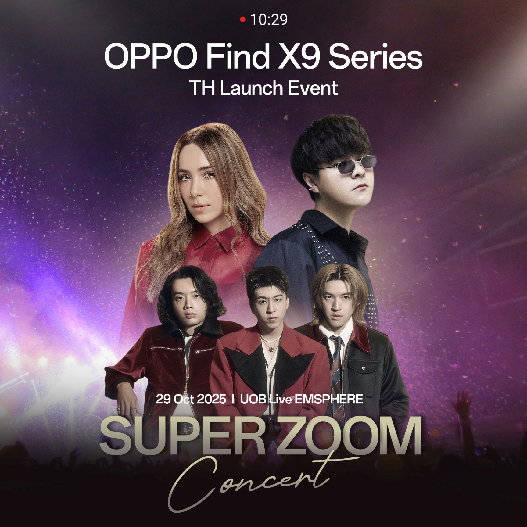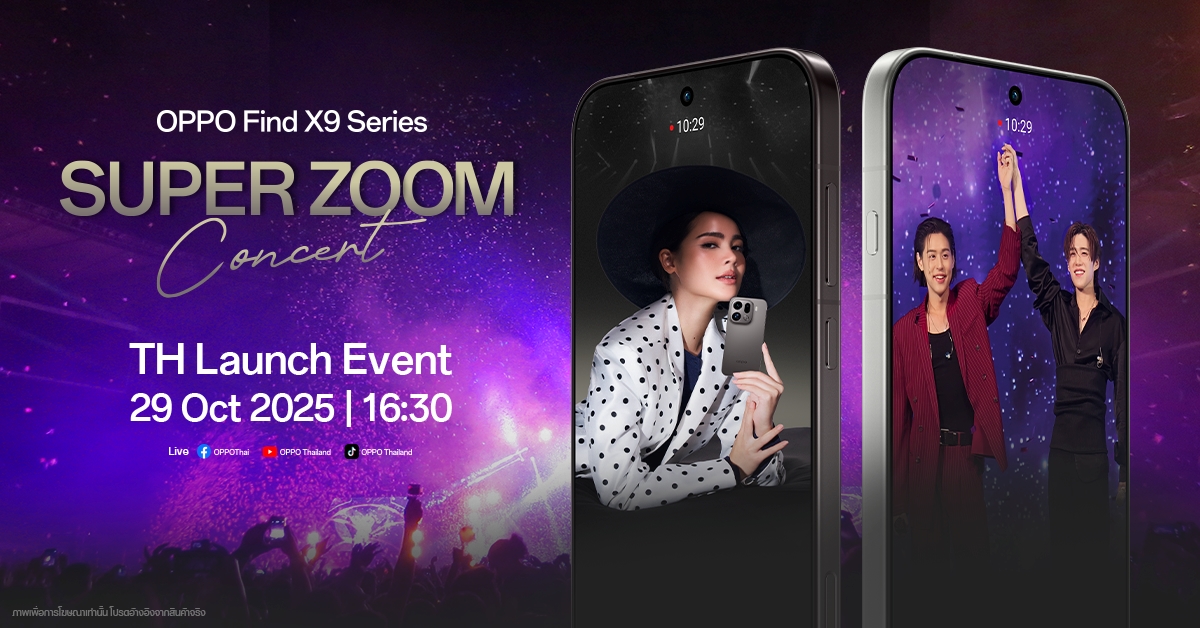 กรุงเทพฯ, 24 ตุลาคม 2568 : ออปโป้ ประเทศไทยเตรียมเปิดตัว OPPO Find X9 Series สมาร์ตโฟนแฟลกชิปซูมดีทุกคอนเสิร์ต พร้อมเตรียมพบกับประสบการณ์ความชัดระดับแฟลกชิปจาก OPPO กับงาน “Super Zoom Concert” คอนเสิร์ตครั้งใหญ่ที่รวมความบันเทิงและเทคโนโลยีเข้าไว้ด้วยกันอย่างลงตัว เพื่อเฉลิมฉลองการเปิดตัวสมาร์ตโฟนรุ่นใหม่ล่าสุด OPPO Find X9 Series สมาร์ตโฟนแฟลกชิปที่พร้อมยกระดับการซูมให้ชัดทุกองศา