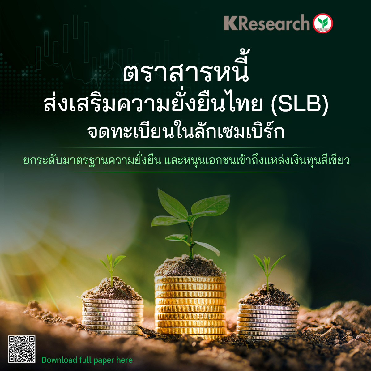 ล่าสุด บริษัท ศูนย์วิจัยกสิกรไทย จำกัด ระบุว่า ไทยเป็นประเทศแรกในอาเซียนที่นำตราสารหนี้ส่งเสริมความยั่งยืน (Sustainability-Linked Bond: SLB) จดทะเบียนในตลาดหลักทรัพย์ลักเซมเบิร์ก ซึ่งเป็นศูนย์กลางการเงินที่ยั่งยืน และมีมาตรฐานด้านความยั่งยืนที่เข้มงวดที่สุดในโลก
