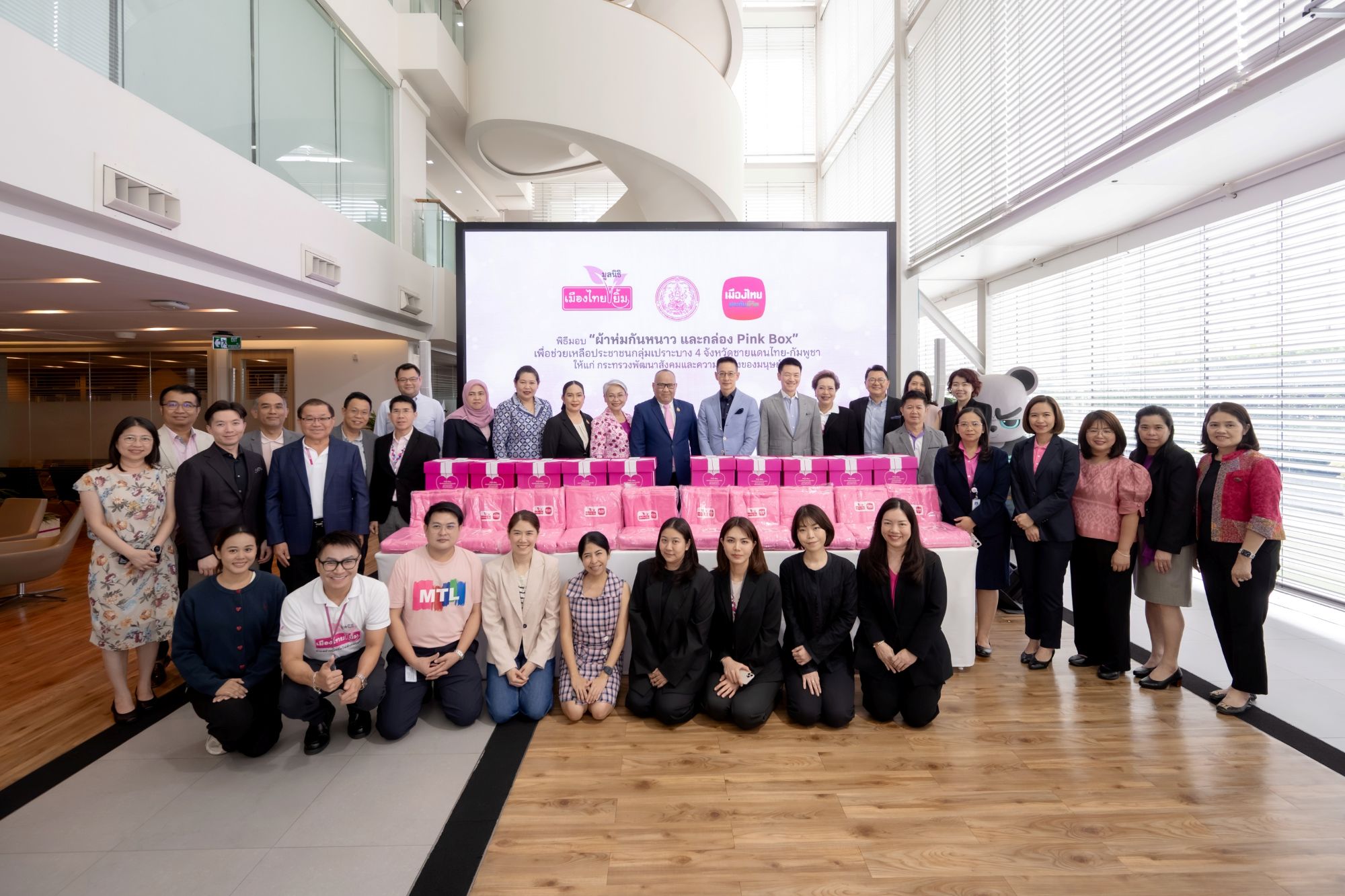 กล่อง “Pink Box” เป็นหนึ่งในกิจกรรมเพื่อสังคมของเมืองไทยประกันชีวิตและมูลนิธิเมืองไทยยิ้มที่จัดขึ้นอย่างต่อเนื่อง เพื่อสานต่องานของกรมกิจการสตรีและสถาบันครอบครัว ในการส่งเสริมความเสมอภาค และเสริมสร้างความเข้มแข็งให้แก่ครอบครัวไทย ภายในกล่องบรรจุสิ่งของจำเป็นในชีวิตประจำวันและของใช้ด้านสุขอนามัย เพื่อมอบให้แก่ “สตรีกลุ่มเปราะบาง” ที่เผชิญกับปัญหาทางสังคมและเศรษฐกิจ อาทิ ผู้หญิงรายได้น้อย แม่เลี้ยงเดี่ยว หญิงตั้งครรภ์ ผู้สูงอายุ ผู้พิการ และครอบครัวที่ยากไร้