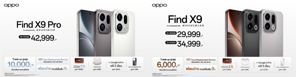 สานต่อความร่วมมือกับ Hasselblad ยกระดับภาพพอร์ตเทรตให้มีมิติ แสง และโทนสีสมจริงแบบธรรมชาติในทุกช็อตผ่านโหมด Hasselblad Portrait เสริมประสิทธิภาพด้วยระบบปฏิบัติการ ColorOS 16 ใหม่ล่าสุด บนดีไซน์ใหม่สะท้อนความพรีเมียมทุกองศา ขอบหน้าจอบางเฉียบ จับถนัดมือ เปิดตัวพร้อมกัน 2 รุ่น ได้แก่ OPPO Find X9 Pro ในราคา 42,999 บาท และ OPPO Find X9 ในราคาเริ่มต้น 29,999 บาท พร้อมหูฟังไร้สายระดับแฟลกชิป OPPO Enco X3s ในราคา 4,999 บาท สัมผัสได้แล้ววันนี้ ณ OPPO Brand Shop ทุกสาขา และตัวแทนจำหน่ายทั่วประเทศ