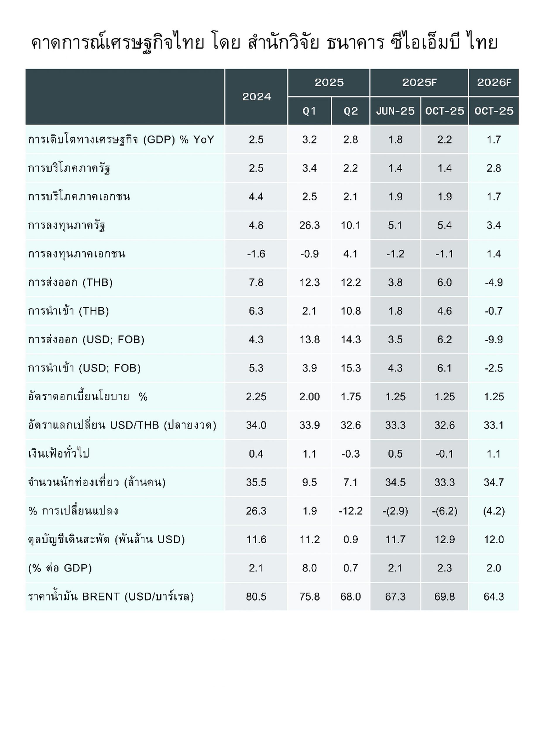 สำนักวิจัย CIMB THAI ประเมินว่าเศรษฐกิจไทยไตรมาส 3 จะขยายตัว 1.2% YoY หรือ -0.48% QoQ หลังปรับฤดูกาล ซึ่งแม้จะเป็นการหดตัวเทียบไตรมาสต่อไตรมาสครั้งแรกในรอบ 10 ไตรมาส หรือนับจากไตรมาส 4 ปี 2565 แต่การหดตัวของเศรษฐกิจไทยครั้งนี้ น่าจะเป็นเพียงช่วงไตรมาส 3 ไม่น่าลากยาวไปสู่ไตรมาส 4 จนเกิดภาวะถดถอยทางเทคนิค หรือเศรษฐกิจหดตัวเทียบไตรมาสต่อไตรมาส สองไตรมาสติดต่อกัน ซึ่งปัจจัยที่กดดันเศรษฐกิจไทยไตรมาส 3 มาจากการบริโภคภาคเอกชนที่แทบไม่ขยายตัวเลยจากไตรมาสก่อน และมาจากการลงทุนภาคเอกชนและการส่งออกสุทธิที่หดตัวจากไตรมาสก่อนหน้า แม้ตัวเลขการส่งออกจะเติบโตดี แต่การนำเข้าก็เร่งแรงเช่นกัน โดยภาพรวม สำนักวิจัย ได้ปรับคาดการณ์ GDP เศรษฐกิจไทยปี 2568 และ 2569 เป็น 2.2% และ 1.7% ตามลำดับ