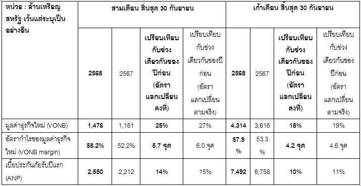 - อัตรากำไรของมูลค่าธุรกิจใหม่ (VONB Margin) ร้อยละ 58.2 เพิ่มขึ้น 5.7 จุด