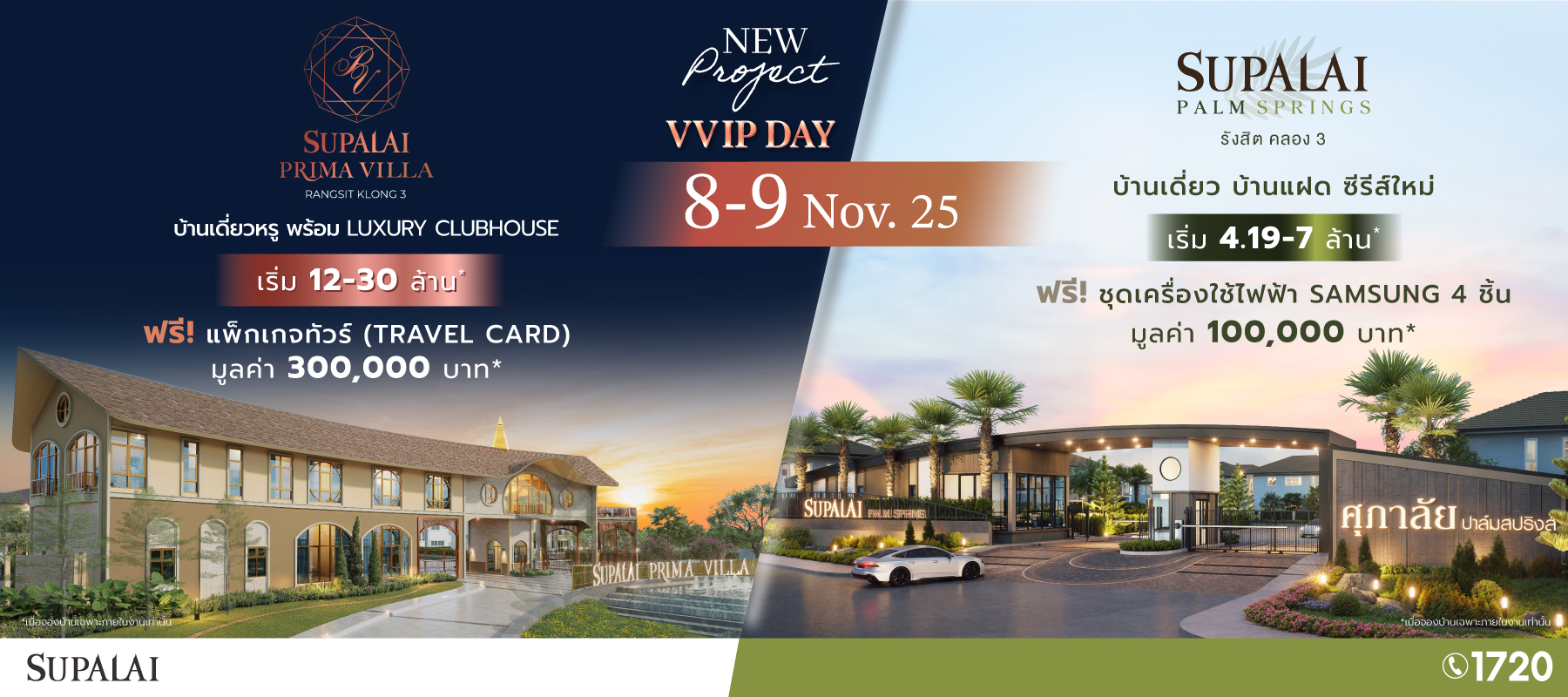 สัมผัสโอกาสพิเศษแห่งการใช้ชีวิตเหนือระดับก่อนใคร กับ 2 โครงการคุณภาพจากศุภาลัย พบกันในงาน “VVIP DAY” วันที่ 8–9 พฤศจิกายนนี้ พร้อมข้อเสนอสุดพิเศษเฉพาะภายในงาน เมื่อจองบ้านเดี่ยวหรูระดับพรีเมียม ศุภาลัย พรีมา วิลล่า รังสิต คลอง 3 ราคาเริ่มต้น 12-30 ล้านบาท* รับทันที ฟรี! แพ็กเกจท่องเที่ยว (Travel Card) มูลค่า 300,000 บาท* หรือเลือกจองบ้านเดี่ยว–บ้านแฝดซีรีส์ใหม่ ศุภาลัย ปาล์มสปริงส์ รังสิต คลอง 3 ราคาเริ่มต้น 4-7 ล้านบาท* พร้อมรับ ฟรี! ชุดเครื่องใช้ไฟฟ้า SAMSUNG 4 ชิ้น มูลค่า 100,000 บาท* สามารถเยี่ยมชมบ้านตัวอย่างได้แล้ววันนี้ (เงื่อนไขเป็นไปตามที่บริษัทฯ กำหนด) สำหรับผู้ที่สนใจ สามารถสอบถามข้อมูลเพิ่มเติมได้ที่ โทร. 1720 หรือเยี่ยมชมรายละเอียดเพิ่มเติมได้ที่ www.supalai.com และ Facebook: Supalai