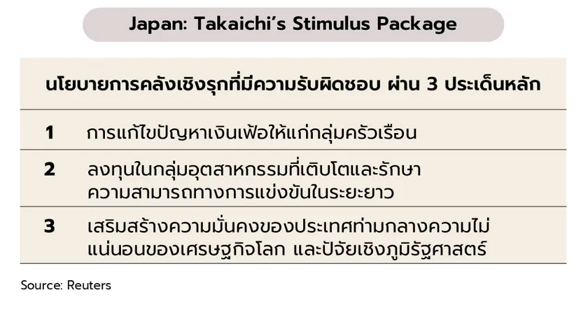 นโยบายการคลังเชิงรุกของรัฐบาลและการบรรลุข้อตกลงทางการค้ากับสหรัฐฯ ช่วยหนุนการฟื้นตัวของเศรษฐกิจญี่ปุ่นในระยะข้างหน้า ธนาคารกลางญี่ปุ่น (BOJ) มีมติ 7-2 ให้คงอัตราดอกเบี้ยนโยบายที่ระดับ 0.50% โดยให้น้ำหนักเรื่องความเสี่ยงต่อเศรษฐกิจรวมถึงความไม่แน่นอนที่เกิดจากมาตรการภาษีของสหรัฐฯ ขณะที่ซานาเอะ ทาคาอิจิ นายกรัฐมนตรีญี่ปุ่นได้ลงนามข้อตกลงทางการค้าและแร่ธาตุสำคัญ (Rare Earth) ผ่านความร่วมมือด้านภาษี การขนส่ง และการลงทุน รวมถึงคำมั่นที่ญี่ปุ่นจะจัดสรรเงินลงทุนในโครงการของสหรัฐฯ มูลค่ากว่า 550,000 ล้านดอลลาร์ฯ อย่างไรก็ตาม ข้อตกลงดังกล่าวยังไม่มีรายละเอียดที่ชัดเจน