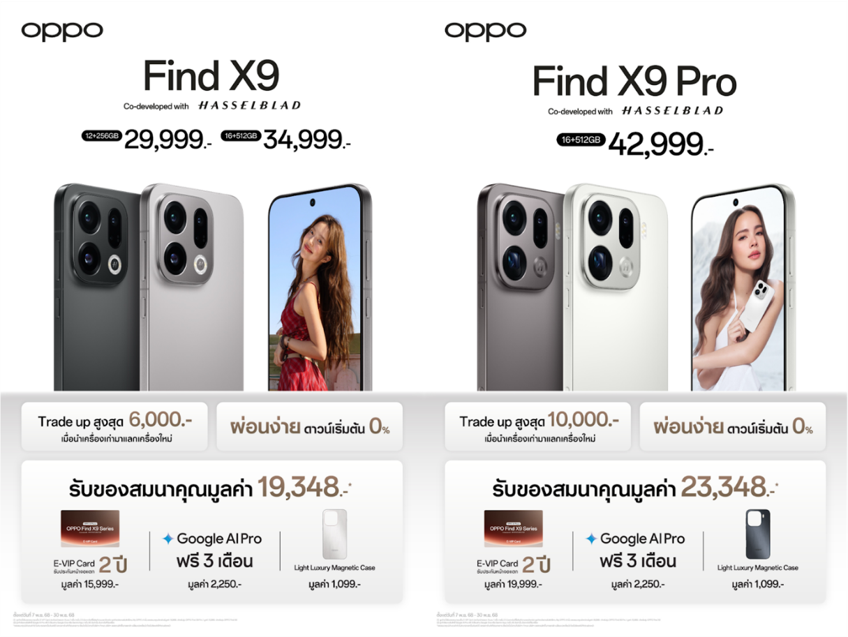 สำหรับผู้ที่สนใจเป็นเจ้าของ OPPO Find X9 Series ในวันที่ 7 – 30 พฤศจิกายน 2568 จะได้รับของสมนาคุณพิเศษมูลค่าสูงสุด 23,348 บาท ดังนี้