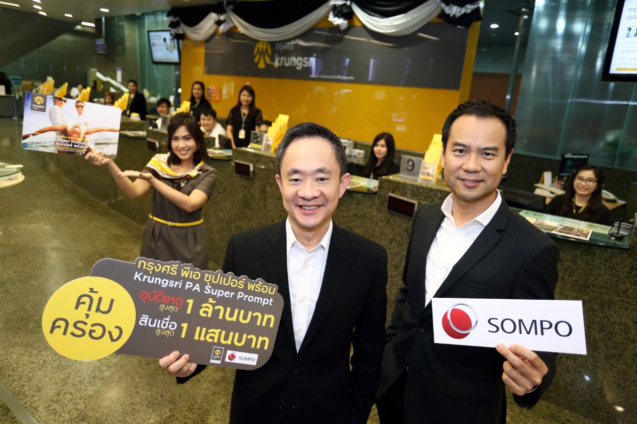 กรุงเทพ 28 กุมภาพันธ์ 2560 : พงษ์อนันต์ ธณัติไตร (ซ้าย) ประธานคณะเจ้าหน้าที่ด้านธุรกิจลูกค้า รายย่อยและเครือข่ายการขาย ธนาคารกรุงศรีอยุธยา จำกัด (มหาชน) และ อิศรศักดิ์ เทศรัตนวงศ์ (ขวา) ประธานเจ้าหน้าที่บริหาร บริษัท ซมโปะ ประกันภัย (ประเทศไทย) จำกัด (มหาชน) นำเสนอ “กรุงศรี พีเอ ซุปเปอร์ พร้อม” ประกันอุบัติเหตุส่วนบุคคลสำเร็จรูปที่พร้อมมอบความคุ้มครองทันที โดยคุ้มครองอุบัติเหตุทั่วไปสูงสุดถึง 1 ล้านบาท คุ้มครองสินเชื่อกรณีเสียชีวิตจากอุบัติเหตุสูงสุด 100,000 บาท และชดเชยรายได้กรณีพักรักษาตัวในโรงพยาบาลวันละ1,000 บาท ซื้อหรือสอบถามข้อมูลเพิ่มเติมได้ที่สาขาของธนาคาร กรุงศรีอยุธยาทั่วประเทศ![]()