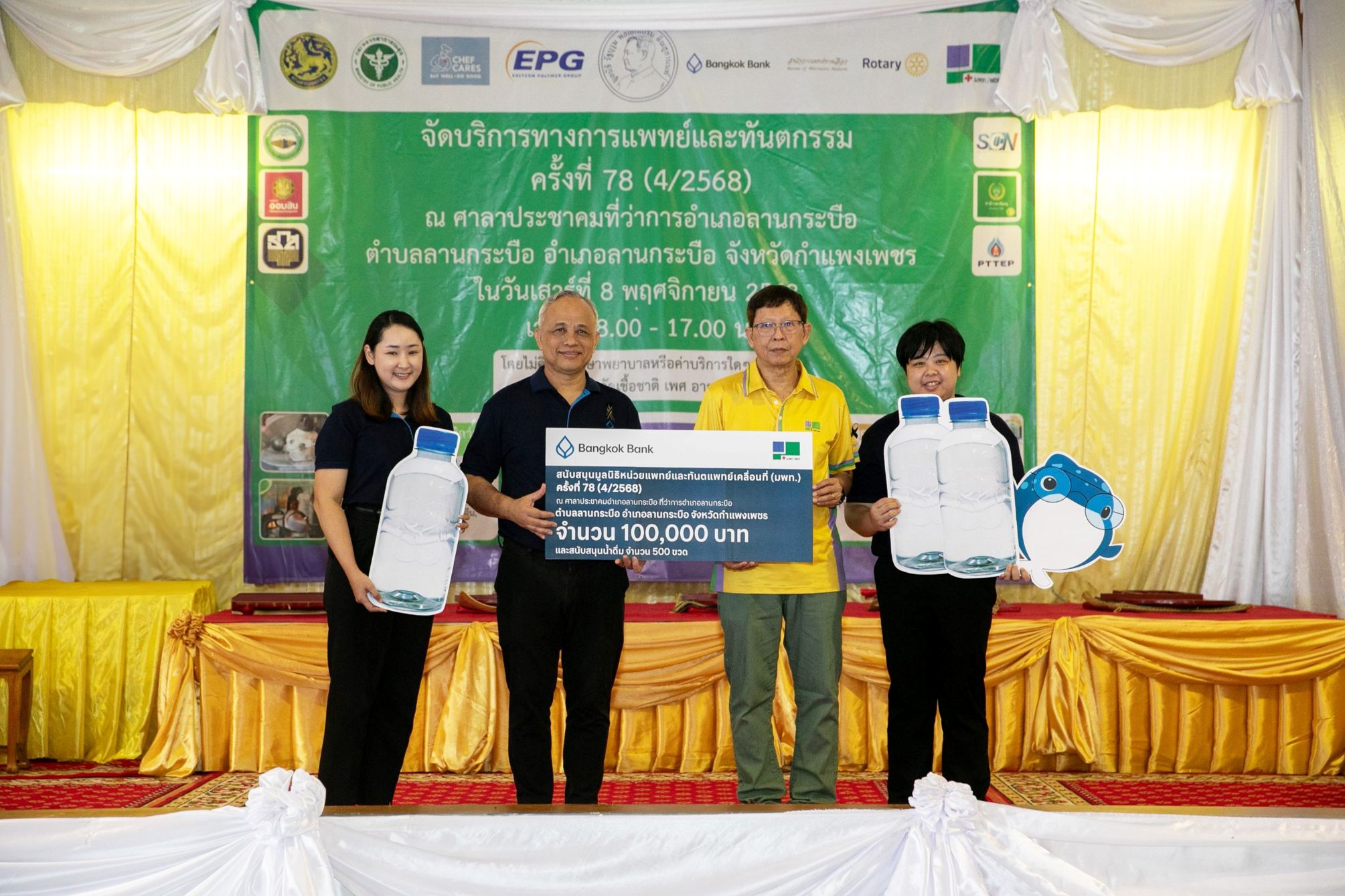 11 พฤศจิกายน 2568 : ธนาคารกรุงเทพ จำกัด (มหาชน) เดินหน้าสานต่อภารกิจเพื่อสังคมอย่างต่อเนื่อง สนับสนุนการจัดกิจกรรม ออกหน่วยแพทย์และทันตแพทย์เคลื่อนที่ ครั้งที่ 78 ซึ่งเป็นครั้งสุดท้ายของปี 2568 โดยมี สุวิทย์ อินทรเฉลิม เจ้าหน้าที่บริหารระดับ Vice President ฝ่ายการประชาสัมพันธ์ แพทย์หญิงศรีเพชร กาญจนกีรณา เจ้าหน้าที่บริหารระดับ Assistant Vice President ฝ่ายบริการสุขภาพ และ นุชชุรี อินโต ผู้จัดการสาขากำแพงเพชร ลงพื้นที่ร่วมมอบเงินสนับสนุนจำนวน 100,000 บาท รถเข็นวีลแชร์ 18 คัน และแว่นสายตายาว 800 อัน พร้อมน้ำดื่ม 500 ขวด เพื่อให้บริการประชาชนในพื้นที่ ซึ่งจัดขึ้น ณ ศาลาประชาคม อำเภอลานกระบือ จังหวัดกำแพงเพชร โดยมีทันตแพทย์ริม เกษสาคร ประธานมูลนิธิหน่วยแพทย์และทันตแพทย์เคลื่อนที่เป็นผู้รับมอบ และได้รับเกียรติจาก นายอนุชา พัสถาน รองผู้ว่าราชการจังหวัดกำแพงเพชร เป็นประธานในพิธี