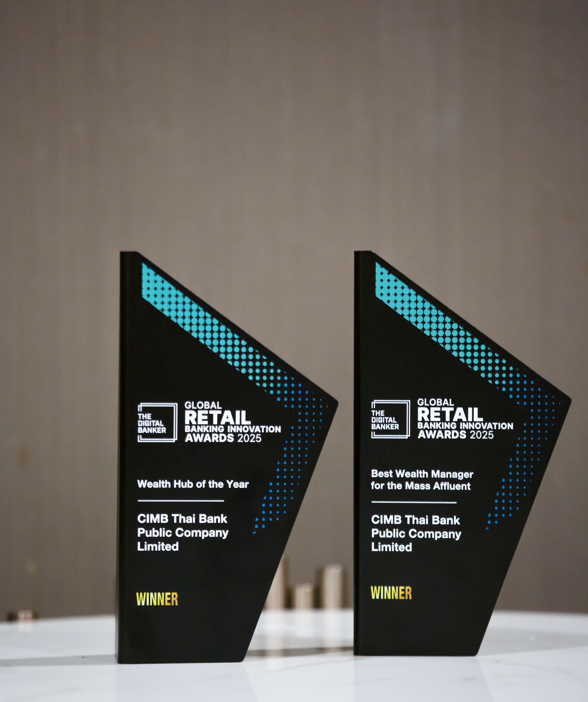 13 พฤศจิกายน 2568 : ธนาคารซีไอเอ็มบี ไทย จำกัด (มหาชน) ประกาศความสำเร็จครั้งสำคัญบนเวทีระดับโลก ด้วยการคว้า 2 รางวัลอันทรงเกียรติจาก Global Retail Banking Innovation Awards 2025 ได้แก่ Best Wealth Manager for the Mass Affluent และ Wealth Hub of the Year ซึ่งสะท้อนถึงความมุ่งมั่นของธนาคารในการยกระดับบริการบริหารความมั่งคั่งแบบครบวงจร ด้วยนวัตกรรมดิจิทัลที่เข้าถึงง่าย ปลอดภัย และตอบโจทย์ทุกความต้องการของลูกค้า โดยมี คุณภูดินันท์ เศรษฐนันท์ Head, Affluent & Wealth Management (ซ้าย) และคุณธนภูมิ สกุลพฤกษาชาติ (ขวา) Head, Investment Products เป็นตัวแทนรับรางวัล