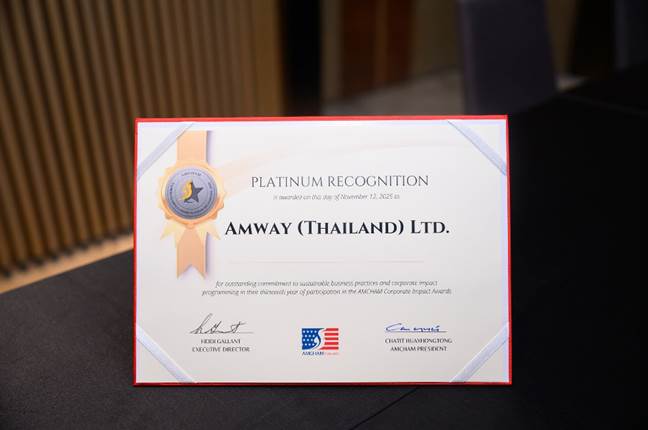 กรุงเทพฯ, 13 พฤศจิกายน 2568 : แอมเวย์ประเทศไทย นำโดยตัวแทนคณะกรรมการกิจกรรมเพื่อสังคม เข้ารับรางวัล “องค์กรที่สร้างความเปลี่ยนแปลงเชิงบวกให้กับสังคม” (AMCHAM Corporate Impact Awards) ระดับแพลตินัม จากหอการค้าอเมริกันในประเทศไทย (The American Chamber of Commerce in Thailand: AMCHAM) ต่อเนื่องเป็นปีที่ 13 ตอกย้ำความเป็นผู้นำด้านความรับผิดชอบต่อสังคมและสร้างความเปลี่ยนแปลงเชิงบวกให้กับผู้คนในสังคมไทย โดยมี คุณแคทเธอรีน สปิลแมน (ที่ 1 จากขวา) อัครราชทูตที่ปรึกษาฝ่ายพาณิชย์ ประจำสถานทูตสหรัฐอเมริกาประจำประเทศไทย มอบรางวัล พร้อมด้วย คุณไซมอน เดนย์ (ที่ 1 จากซ้าย) กรรมการบริหารหอการค้าอเมริกันในประเทศไทย ร่วมแสดงความยินดี ณ โรงแรม นิกโก้ กรุงเทพฯ เมื่อเร็ว ๆ นี้