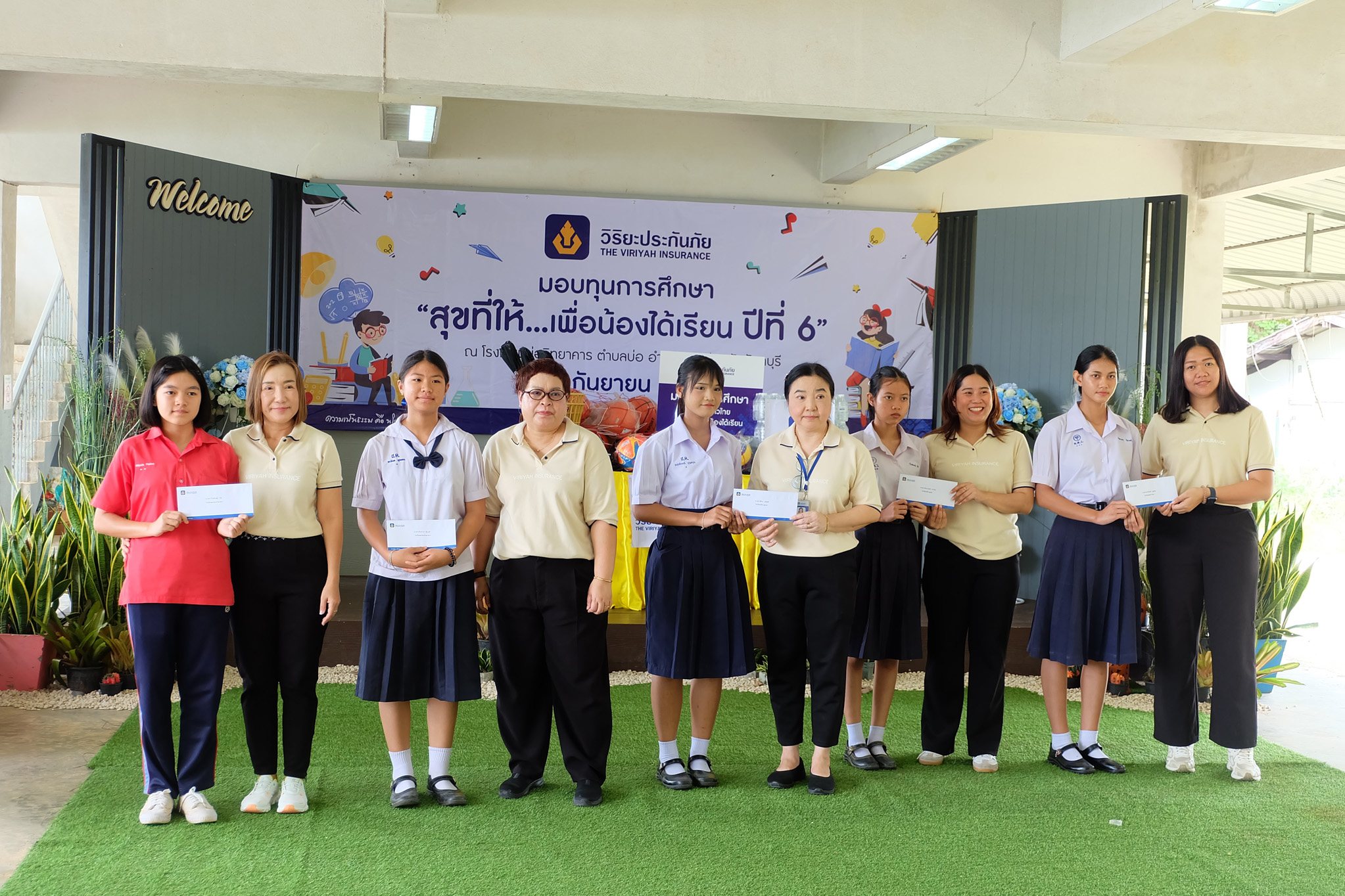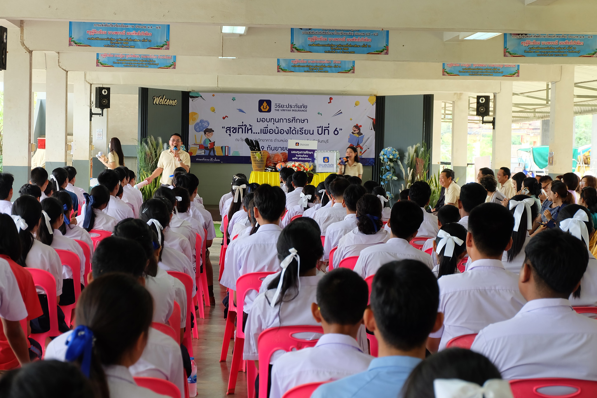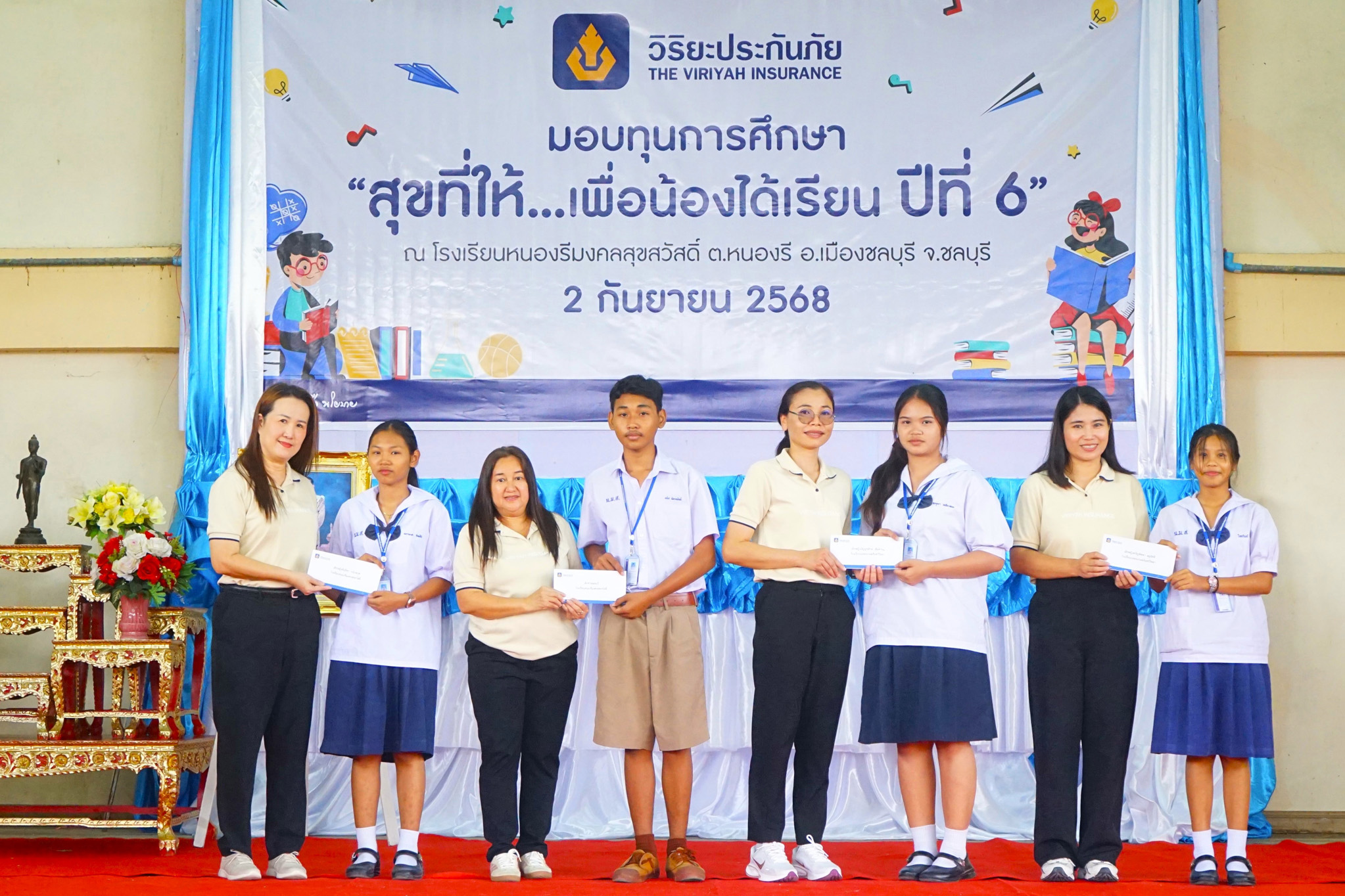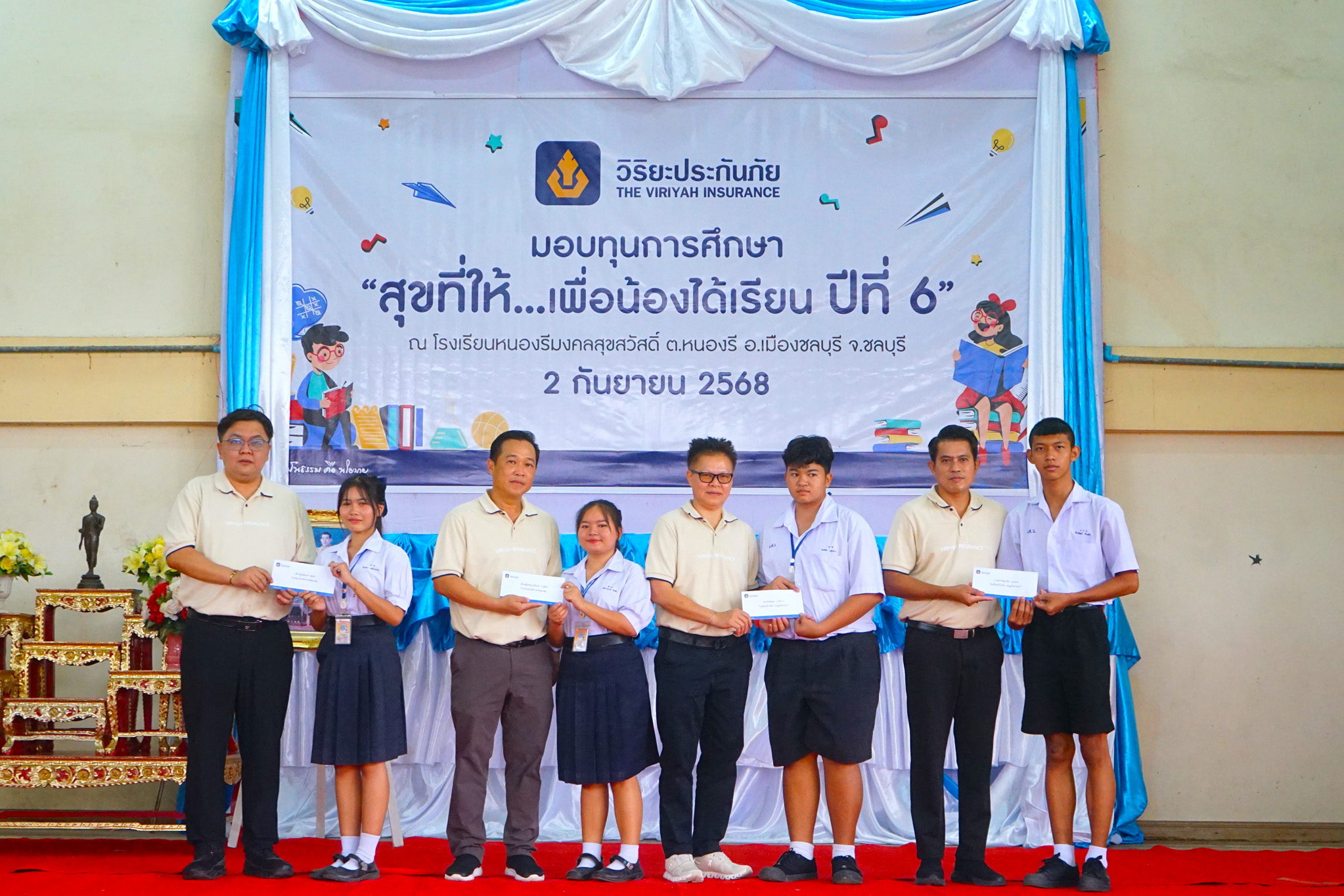 13 พฤศจิกายน 2568 : เธียรวิทย์ หาญเมธีคุณา ผู้จัดการฝ่ายปฏิบัติการภาค 3 (ภาคตะวันออก) ด้านสาขา และ พงษ์ทิวา กฤษณพันธุ์ ผู้จัดการฝ่ายปฏิบัติการภาค 3 (ภาคตะวันออก) ด้านศูนย์ปฏิบัติการสินไหมทดแทน บริษัท วิริยะประกันภัย จำกัด (มหาชน) เป็นผู้แทนมอบทุนการศึกษา จำนวน 228 ทุน เป็นเงิน 228,000 บาท และทุนสนับสนุนสื่อการเรียนรู้ เป็นเงิน 115,000 บาท รวมทั้งสิ้น 343,000 บาท ภายใต้โครงการ “สุขที่ให้…เพื่อน้องได้เรียน” ปีที่ 6 เพื่อส่งเสริมโอกาสทางการศึกษาให้กับนักเรียนที่มีผลการเรียนดีแต่ขาดแคลนทุนทรัพย์ โดยบริษัทฯ ได้จัดพิธีมอบทุนการศึกษา จำนวน 128 ทุน เป็นเงิน 128,000 บาท พร้อมมอบทุนสนับสนุนสื่อการเรียนรู้ เป็นเงิน 70,000 บาท แก่โรงเรียนในพื้นที่จังหวัดชลบุรีทั้งหมด 22 แห่ง โดยมี นายวสุพจน์ นออ่อน ผู้อำนวยการโรงเรียนหนองรีมงคลสุขสวัสดิ์ เป็นผู้แทนรับมอบ ณ โรงเรียนหนองรีมงคลสุขสวัสดิ์ ต.หนองรี อ.เมืองฯ จ.ชลบุรี