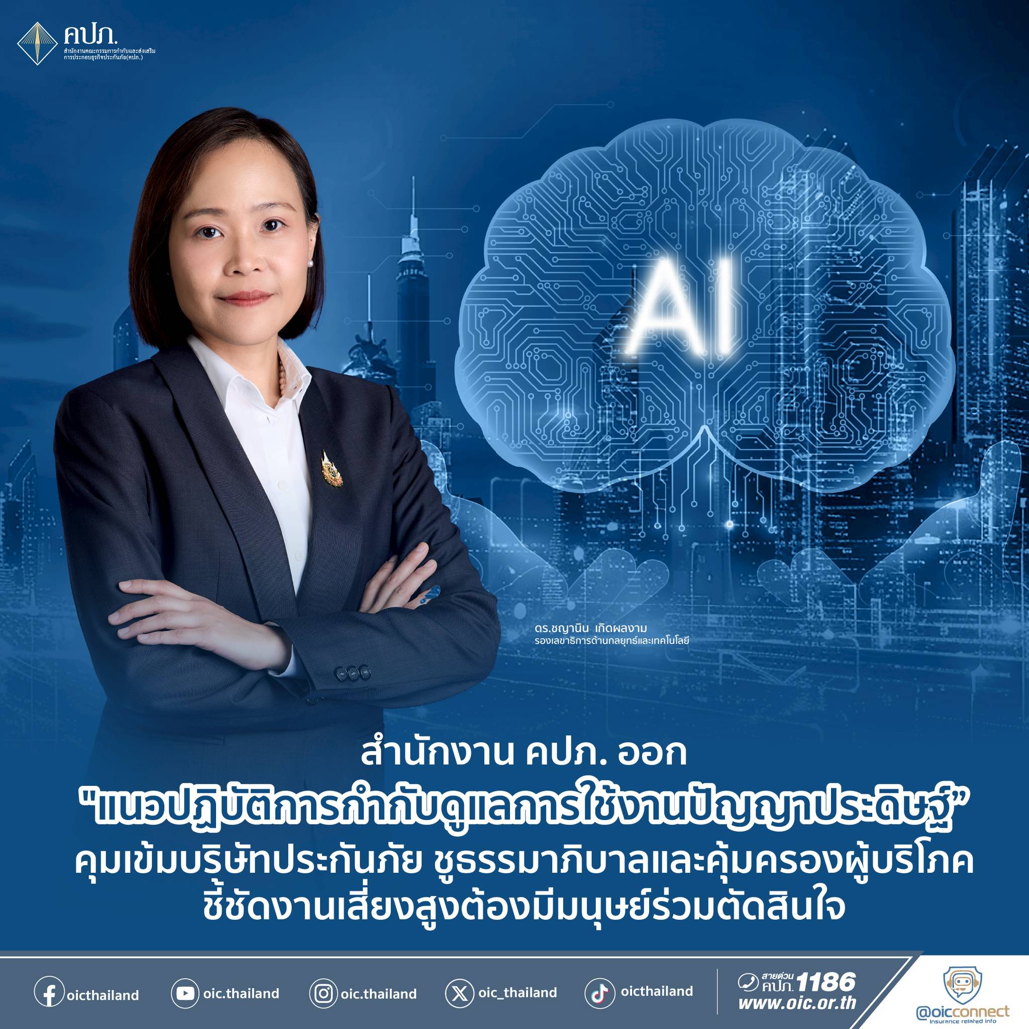 17 พฤศจิกายน 2568 : ดร.ชญานิน เกิดผลงาม รองเลขาธิการด้านกลยุทธ์และเทคโนโลยี สำนักงานคณะกรรมการกำกับและส่งเสริมการประกอบธุรกิจประกันภัย (สำนักงาน คปภ.) เผยแพร่ แนวปฏิบัติ เรื่อง “การกำกับดูแลการใช้งานปัญญาประดิษฐ์ สำหรับบริษัทประกันภัย (AI Governance Guideline) พ.ศ. 2568” เพื่อเป็นกรอบกำกับดูแลการประยุกต์ใช้เทคโนโลยีปัญญาประดิษฐ์ในภาคธุรกิจประกันภัย โดยมุ่งสร้างสมดุลระหว่างการคุ้มครองผู้บริโภคกับการส่งเสริมนวัตกรรม เพื่อให้การประยุกต์ใช้ AI ในภาคธุรกิจประกันภัย เกิดขึ้นอย่างรับผิดชอบ โปร่งใส และมีความมั่นคงปลอดภัย โดยแนวปฏิบัตินี้ได้ผ่านการเปิดรับฟังความคิดเห็นจากสาธารณะมาก่อนแล้ว ซึ่งแนวปฏิบัติดังกล่าวจัดทำขึ้นภายใต้หลัก Risk-Based Proportionality เพื่อให้บริษัทประกันภัยสามารถประเมินระดับความเสี่ยงของเทคโนโลยีที่ใช้และนำไปปรับใช้ตามระดับความเสี่ยงของเทคโนโลยี AI ครอบคลุม 4 หลักสำคัญ ได้แก่
