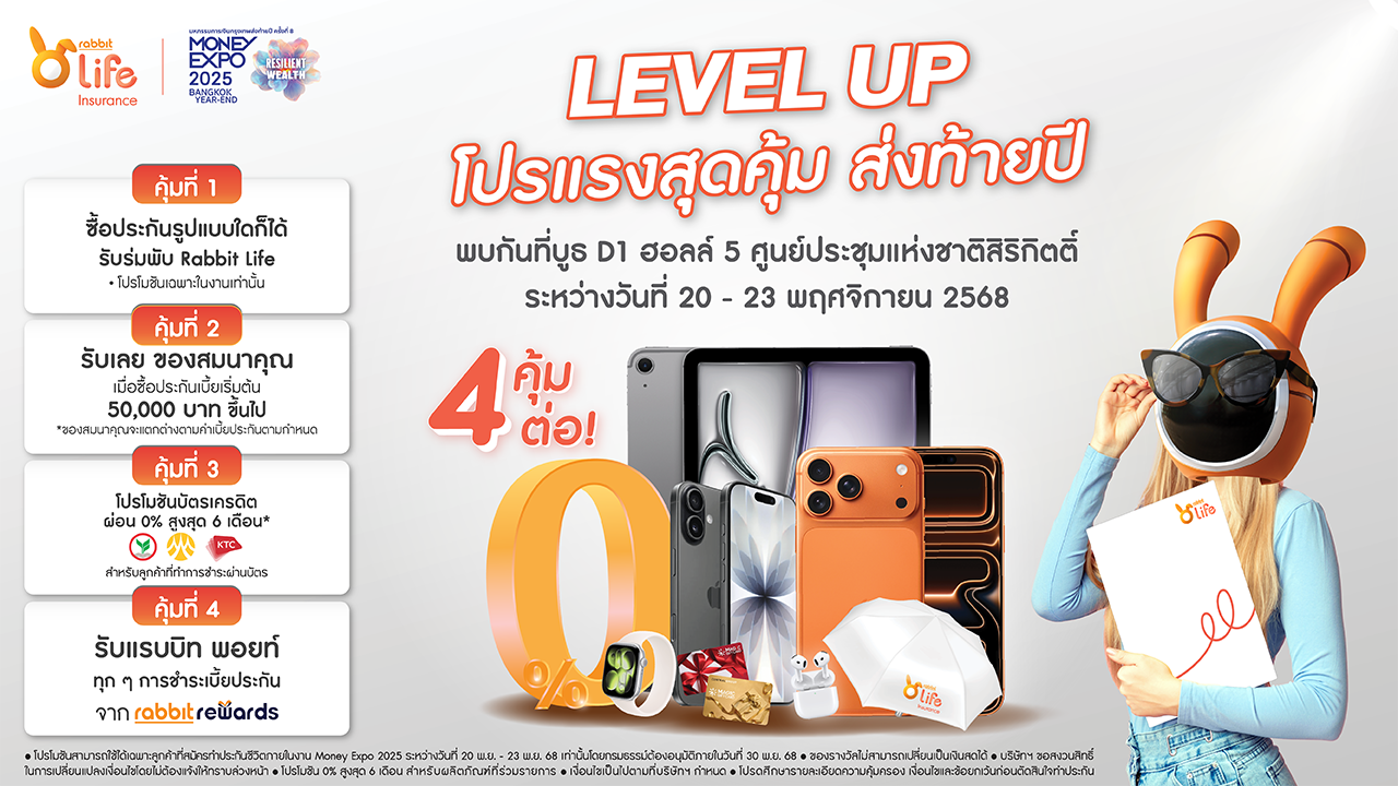 กรุงเทพฯ 17 พฤศจิกายน 2568 : บริษัท แรบบิท ประกันชีวิต จำกัด (มหาชน) หรือ Rabbit Life บริษัทในเครือบริษัท บีทีเอส กรุ๊ป โฮลดิ้งส์ จำกัด (มหาชน) เตรียมยกทัพผลิตภัณฑ์ประกันลดหย่อนภาษีและโปรโมชันเด็ดส่งท้ายปี ร่วมงานมหกรรมการเงินกรุงเทพครั้งที่ 25 (MONEY EXPO BANGKOK YEAR- END 2025) จัดขึ้นภายใต้แนวคิด Resilient Wealth to Level Up Life หรือการสร้างความมั่งคั่งแบบยืดหยุ่น ทางด้านการเงิน สุขภาพ และการใช้ชีวิต พร้อมพลิกเกมความคุ้มแบบก้าวกระโดดถึง 4 คุ้ม ไม่ว่าจะเป็น