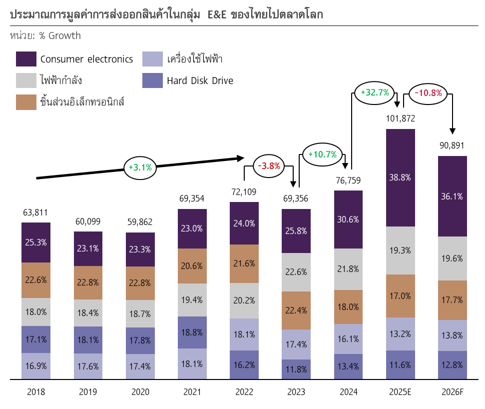 แม้ว่าในปี 2568 การส่งออกสินค้าอิเล็กทรอนิกส์ของไทยจะมีแนวโน้มขยายตัวได้ดีต่อเนื่อง จากอานิสงส์การเร่งนำเข้าและวัฏจักรขาขึ้นของสินค้าอิเล็กทรอนิกส์โดยเฉพาะในกลุ่มสินค้าคอมพิวเตอร์และ HDD ที่ได้รับปัจจัยหนุนจากแนวโน้มความต้องการเทคโนโลยี AI และธุรกิจ Data center ที่ขยายตัว โดยคาดว่าจะเติบโตสูงถึงราว 33% YoY แต่ในปี 2569 คาดว่าอุตสาหกรรมอิเล็กทรอนิกส์ของไทยในภาพรวมมีแนวโน้มกลับมาหดตัว -10.8%YOY แม้ในช่วงครึ่งปีแรกของปี 2569 การส่งออกในกลุ่มสินค้า Hi-Tech เช่น คอมพิวเตอร์และส่วนประกอบ ยังคงได้รับอานิสงส์จากวัฏจักรขาขึ้นที่สิ้นสุดลงช้ากว่าที่คาดจากอุปสงค์ต่อผลิตภัณฑ์ที่เกี่ยวเนื่องกับ AI ที่ดีต่อเนื่อง