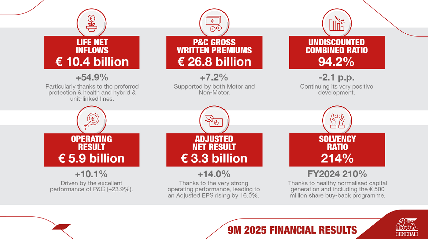 โดยในช่วง 9 เดือนของปี 2025 ผ่านมา เจนเนอราลี่ กรุ๊ป สามารถสร้างการเติบโตอย่างต่อเนื่องเมื่อเทียบกับช่วงเดียวกันของปีก่อน โดยมี เบี้ยประกันภัยรับรวม (Gross Written Premium) อยู่ที่ประมาณ 2.79 ล้านล้านบาท (73.1 พันล้านยูโร) เพิ่มขึ้น 3.7% ขณะที่ ธุรกิจประกันชีวิต (Life Net Inflow) มียอดเงินไหลเข้าสุทธิ อยู่ที่ประมาณ 3.96 แสนล้านบาท (10.4 พันล้านยูโร) ด้านธุรกิจบริหารสินทรัพย์และความมั่งคั่ง (Asset & Wealth Management) ที่ยังคงเติบโตในทิศทางบวก อยู่ที่ 32.16 พันล้านบาท (843 ล้านยูโร) เพิ่มขึ้น 0.7% ส่งผลให้ผลการดำเนินงาน (Operating Result) เพิ่มขึ้นอย่างมีนัยสำคัญเป็น 2.27 แสนล้านบาท (5.9 พันล้านยูโร) เพิ่มขึ้น 10.1%