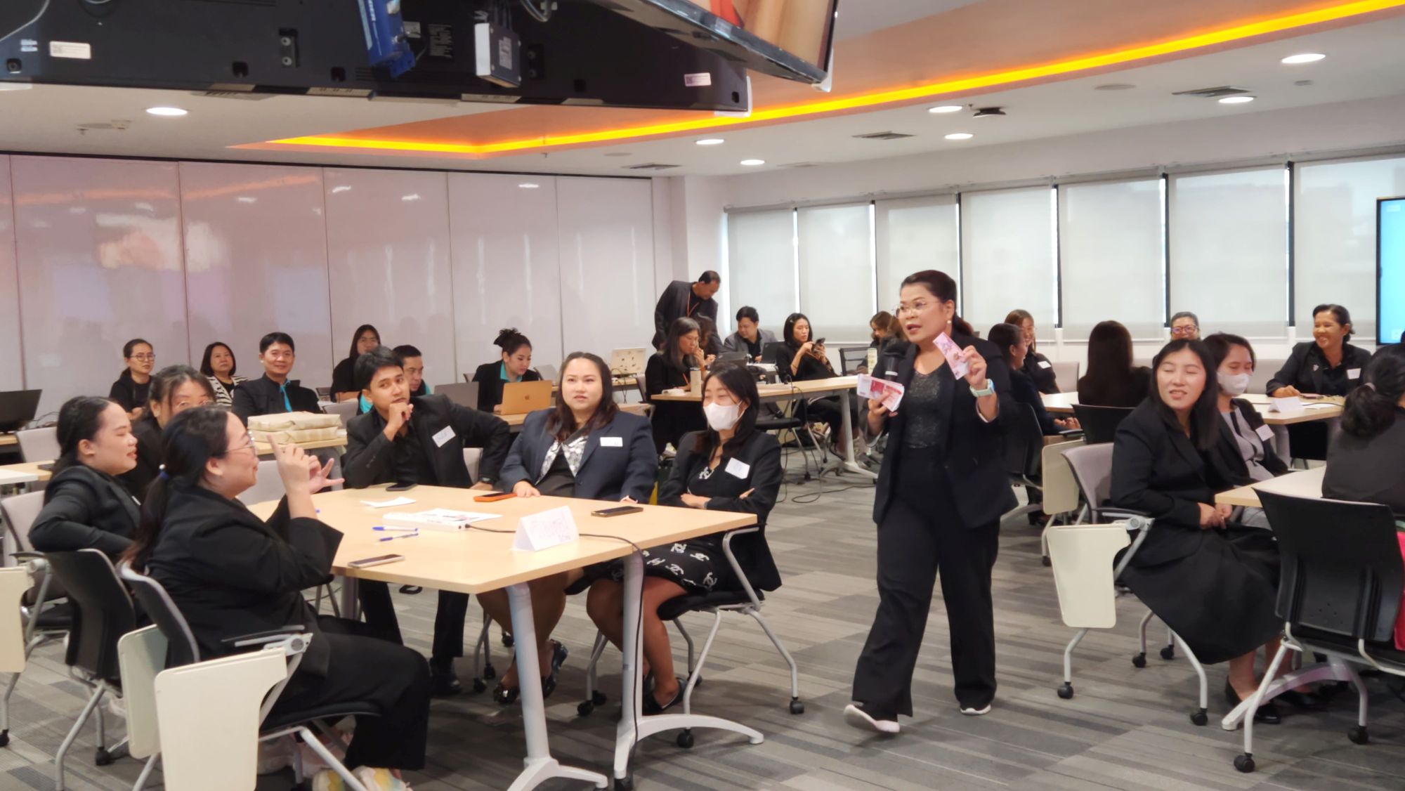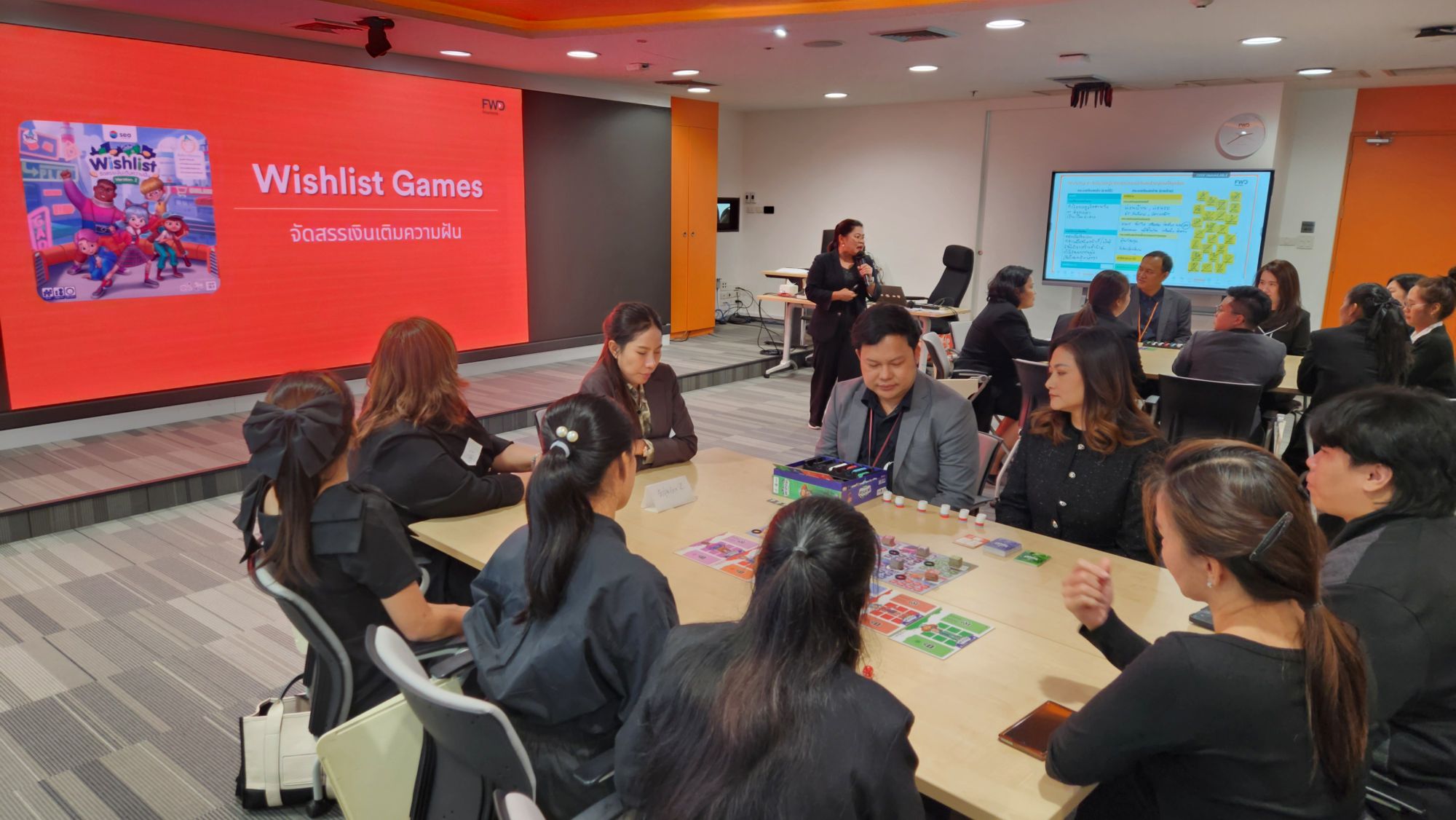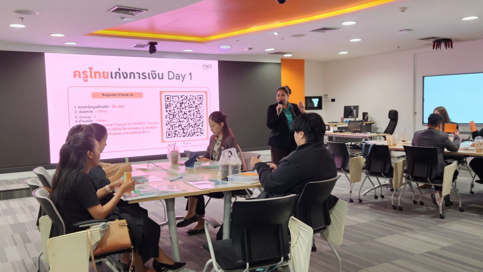 เวิร์กช็อปจัดขึ้นต่อเนื่องเป็นเวลา 2 วัน มีครู 33 คนจาก 10 โรงเรียนเข้าร่วมกิจกรรมที่ออกแบบมาเพื่อเรียนรู้เรื่องการเงินผ่านการลงมือทำจริง โดยมีทีมวิทยากรผู้เชี่ยวชาญจาก Business Training Center ของ FWD นำโดยคุณพอลล่า – ศรีประไพ นามแสน ที่ปรึกษาการเงิน AFPT™ (Associate Financial Planner Thailand) และคุณบอล – อภิวิชญ์ ไพศาลทรัพย์ นักวางแผนการเงิน Certified Financial Planner (CFP) ทำหน้าที่บรรยายและให้คำแนะนำตลอดการอบรม พร้อมด้วยวิทยากรจิตอาสาจาก FWD รวม 15 คน ร่วมสร้างบรรยากาศแห่งการเรียนรู้ที่สนุกสนานและเต็มไปด้วยการแลกเปลี่ยนประสบการณ์