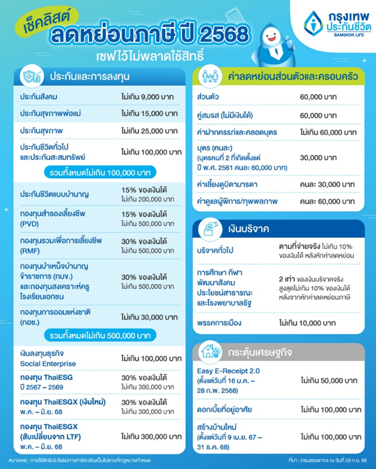 24 พฤศจิกายน 2568 : ถึงช่วงฤดูกาลวางแผนภาษีประจำปี ซึ่งถือเป็นเรื่องสำคัญที่ผู้มีเงินได้ทุกคนไม่ควรมองข้าม เพราะเป็นอีกหนึ่งโอกาสในการบริหารเงินให้เกิดประโยชน์สูงสุด หลายคนอาจกำลังมองหาวิธีลดหย่อนภาษีที่คุ้มค่า บทความนี้ได้รวบรวมสิทธิลดหย่อนภาษีบุคคลธรรมดาที่ควรรู้ พร้อมแนะนำแนวทางการใช้สิทธิลดหย่อนภาษีให้เกิดประสิทธิภาพสูงสุด