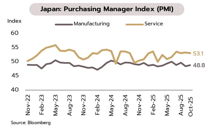 แม้มีปัจจัยบวกจากมาตรการกระตุ้นเศรษฐกิจ แต่ความขัดแย้งกับจีนเพิ่มความไม่แน่นอนต่อแนวโน้มเศรษฐกิจญี่ปุ่น GDP ของญี่ปุ่นในไตรมาส 3 หดตัวครั้งแรกในรอบ 6 ไตรมาส ที่ -1.8% YoY และ -0.4% QoQ โดยการส่งออกลดลง -1.2% QoQ ขณะที่ PMI ภาคการผลิตหดตัวต่อเนื่องเป็นเดือนที่ 5 ที่ 48.8 ในเดือนพฤศจิกายน ส่วน PMI ภาคบริการขยายตัวต่อเนื่องที่ 53.1 นอกจากนี้ นายกรัฐมนตรี ซานาเอะ ทาคาอิจิ อนุมัติมาตรการกระตุ้นเศรษฐกิจขนาดใหญ่ มูลค่ารวม 21.3 ล้านล้านเยน เพื่อรับมือกับภาวะเศรษฐกิจชะลอตัว และบรรเทาผลกระทบจากภาวะเงินเฟ้อ