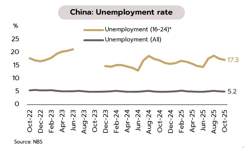 ความอ่อนแอในตลาดแรงงานและภาคอสังหาริมทรัพย์ยังคงบั่นทอนการเติบโตทางเศรษฐกิจของจีน อัตราการว่างงานในกลุ่มคนหนุ่มสาว (16-24 ปีไม่รวมนักเรียน) ในเดือนตุลาคมยังคงอยู่ในระดับสูงที่ 17.3% ขณะที่ยอดขายบ้านใหม่ของผู้พัฒนาอสังหาฯ 100 อันดับแรกหดตัวแรงที่สุดในรอบหนึ่งปีที่ -41.9% YoY ส่วนราคาบ้านใหม่และบ้านมือสองเฉลี่ยใน 70 เมืองหดตัวต่อเนื่องนานเกือบ 4 ปีในเดือนตุลาคมที่ -2.6% และ -5.4% ตามลำดับ ล่าสุด รัฐบาลกำลังพิจารณาออกมาตรการเพิ่มเติมเพื่อเร่งแก้ไขวิกฤตในภาคอสังหาฯ เช่น เงินอุดหนุนสำหรับผู้ซื้อบ้านใหม่ การเพิ่มเงินคืนภาษีสำหรับผู้กู้ซื้อบ้าน และการลดต้นทุนในการทำธุรกรรมการซื้อบ้าน