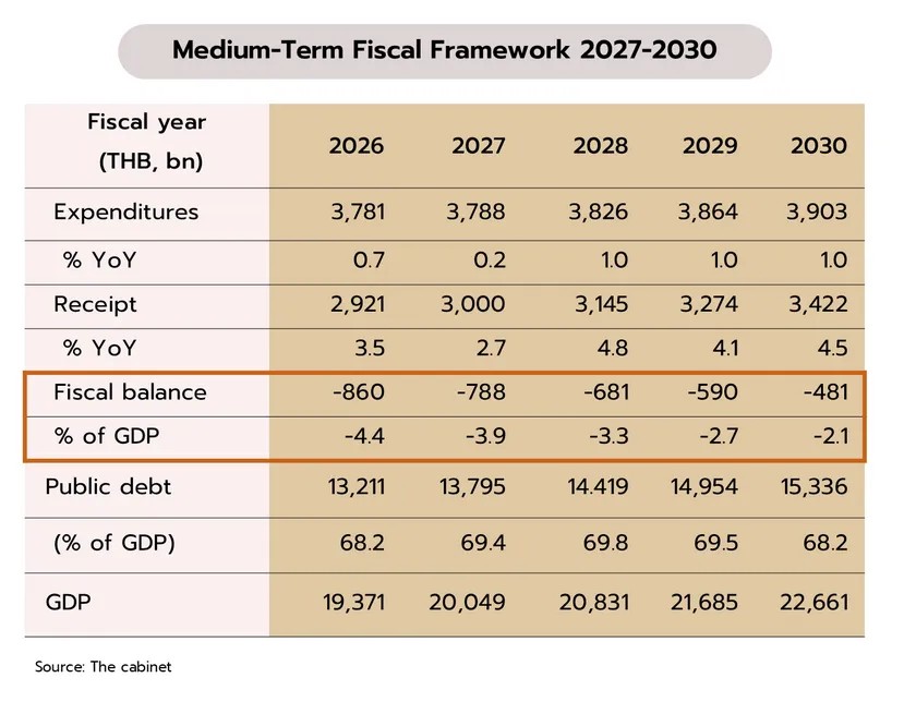 การกำหนดกรอบวินัยการคลังที่เข้มงวดขึ้นสะท้อนความพยายามของรัฐบาลในการปรับสมดุลระหว่างการกระตุ้นเศรษฐกิจและการรักษาเสถียรภาพทางการคลังในระยะยาว ซึ่งมีความสำคัญอย่างยิ่งในช่วงที่สถาบันจัดอันดับเครดิตสำคัญ 2 แห่งได้ปรับแนวโน้มเครดิต (Outlook) ของไทยลงสู่เชิงลบ (Negative) (เดือนเมษายนและกันยายนที่ผ่านมา) การกำหนดเป้าหมายลดขาดดุลทางการคลังให้ต่ำกว่า 3% ภายในปี 2572 เร็วขึ้นจากการแผนครั้งก่อน รวมถึงการจำกัดงบกลาง งบใช้คืนหนี้ และงบผูกพัน จะช่วยเพิ่มความโปร่งใสและความน่าเชื่อถือของกระบวนการจัดทำงบประมาณ ตลอดจนแสดงความมุ่งมั่นที่จำกัดการเพิ่มขึ้นของหนี้สาธารณะไม่ให้สูงเกินเพดาน 70% ของ GDP ซึ่งเป็นจุดที่ตลาดการเงินให้ความสำคัญ