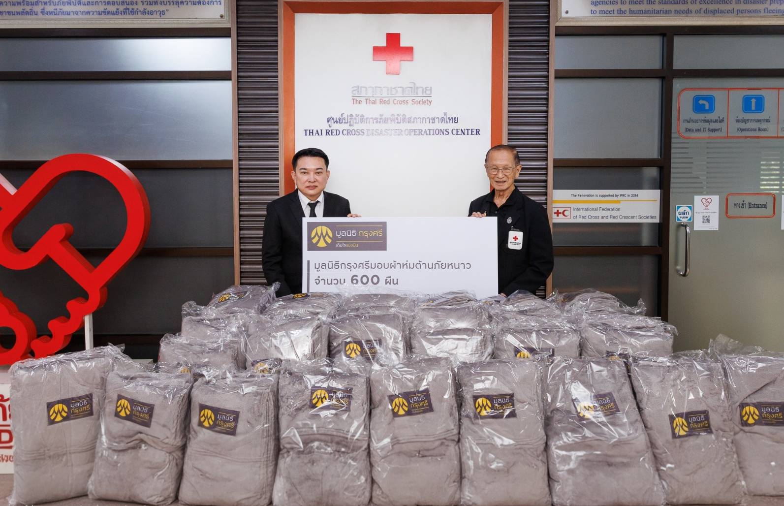 กรุงเทพฯ, 26 พฤศจิกายน 2568 : พูนสิทธิ์ ว่องธวัชชัย (ซ้าย) ผู้ช่วยเลขานุการ มูลนิธิกรุงศรี มอบผ้าห่มจำนวน 600 ผืน พร้อมน้ำดื่มเพื่อสนับสนุนภารกิจบรรเทาทุกข์และช่วยเหลือผู้ประสบภัย แก่สำนักงานบรรเทาทุกข์และประชานามัยพิทักษ์ สภากาชาดไทย โดยมี พลโท นายแพทย์ อำนาจ บาลี (ขวา) ผู้อำนวยการสำนักงานบรรเทาทุกข์และประชานามัยพิทักษ์ สภากาชาดไทย เป็นผู้รับมอบ ณ ศูนย์ปฏิบัติการภัยพิบัติ สภากาชาดไทย