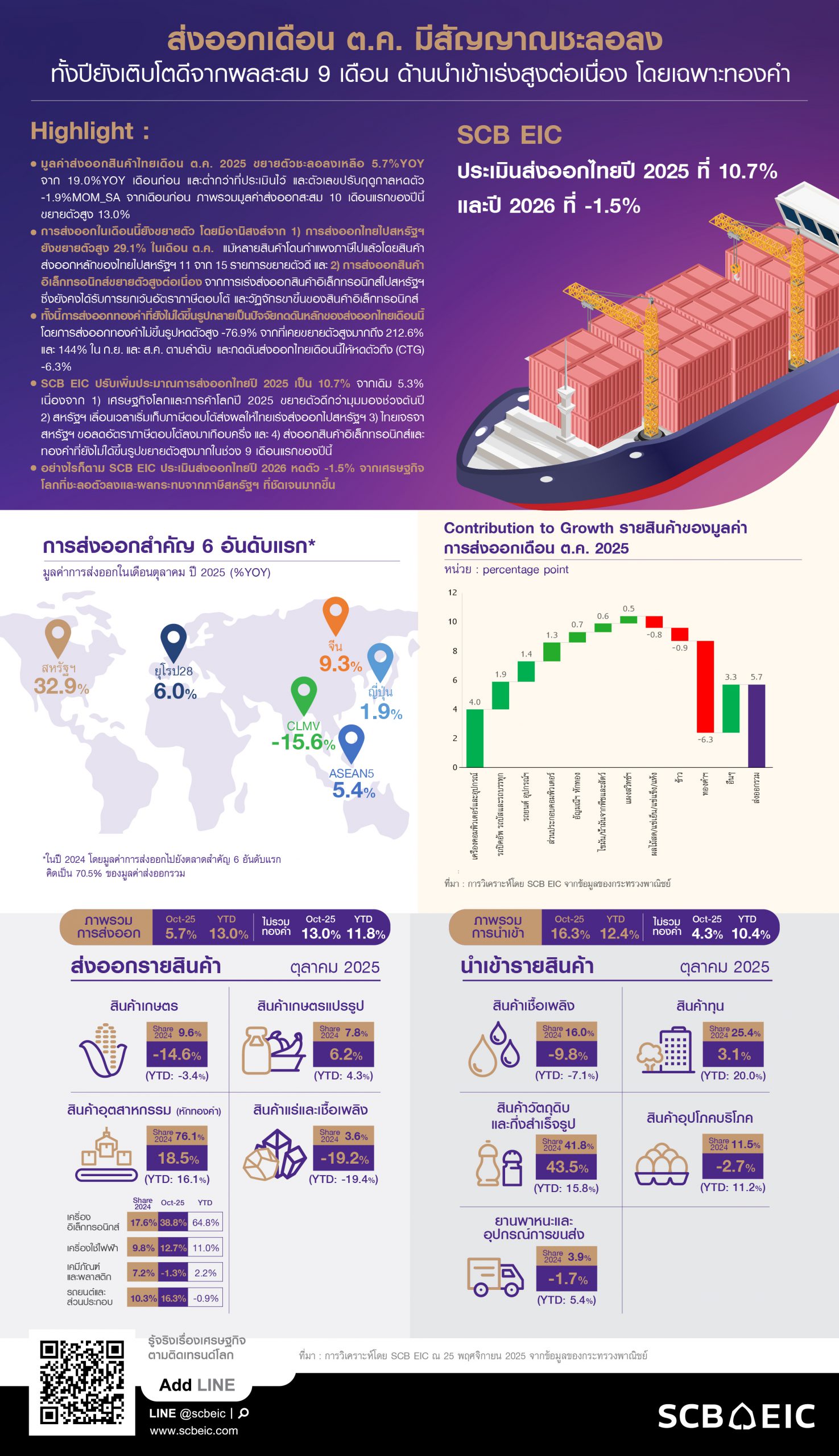 SCB EIC ปรับเพิ่มประมาณการส่งออกไทยปี 2025 ขยายตัว 10.7% ตามข้อมูล 9 เดือนสะสมที่สูงกว่าคาด มุมมองส่งออกปี 2026 มีแนวโน้มหดตัว -1.5%