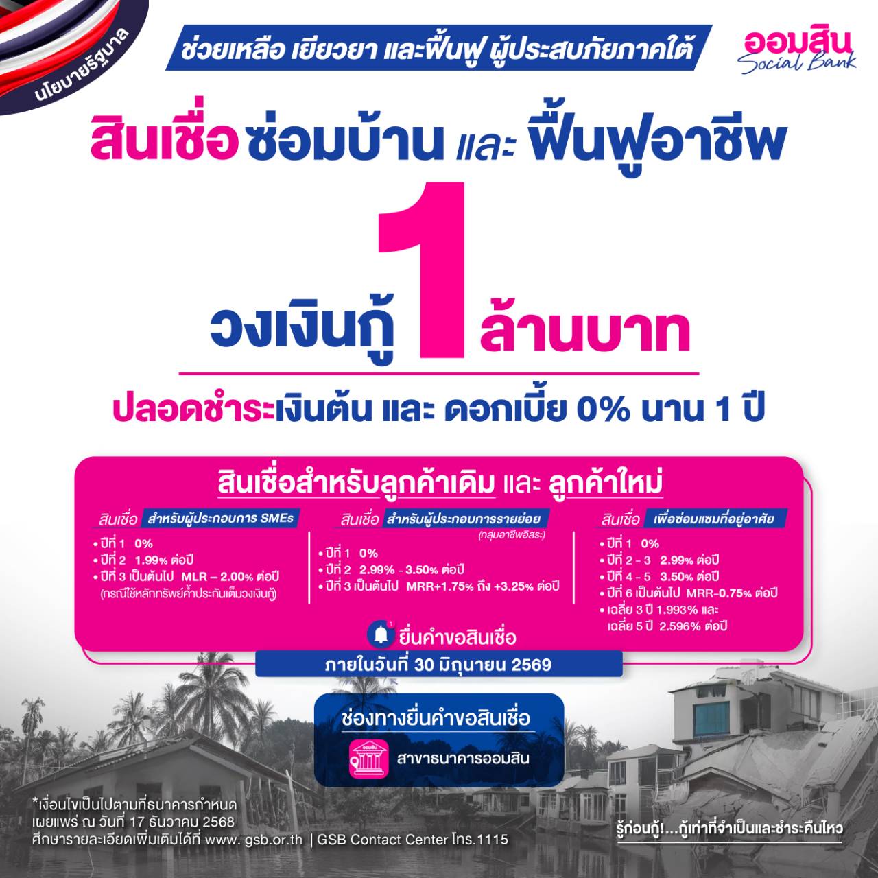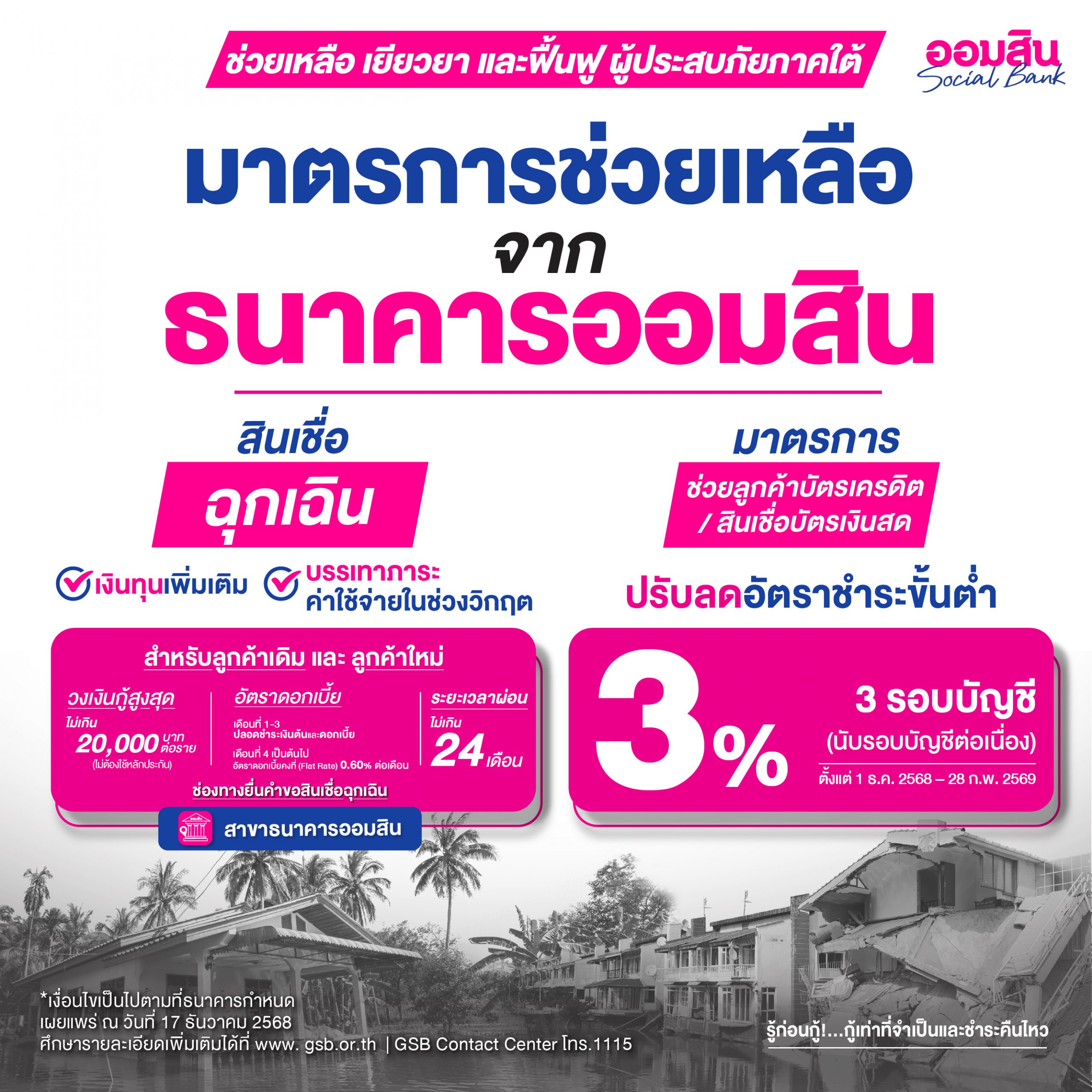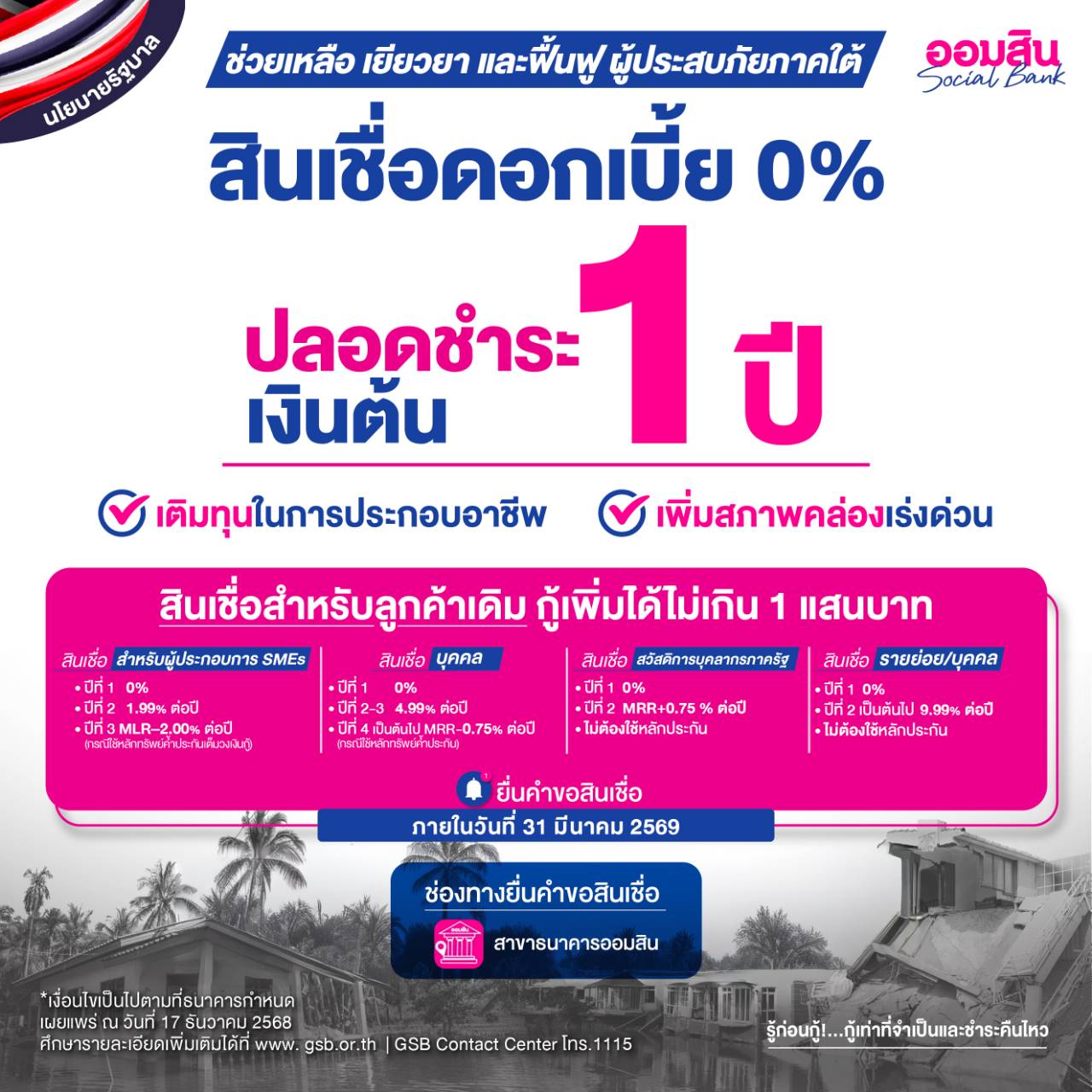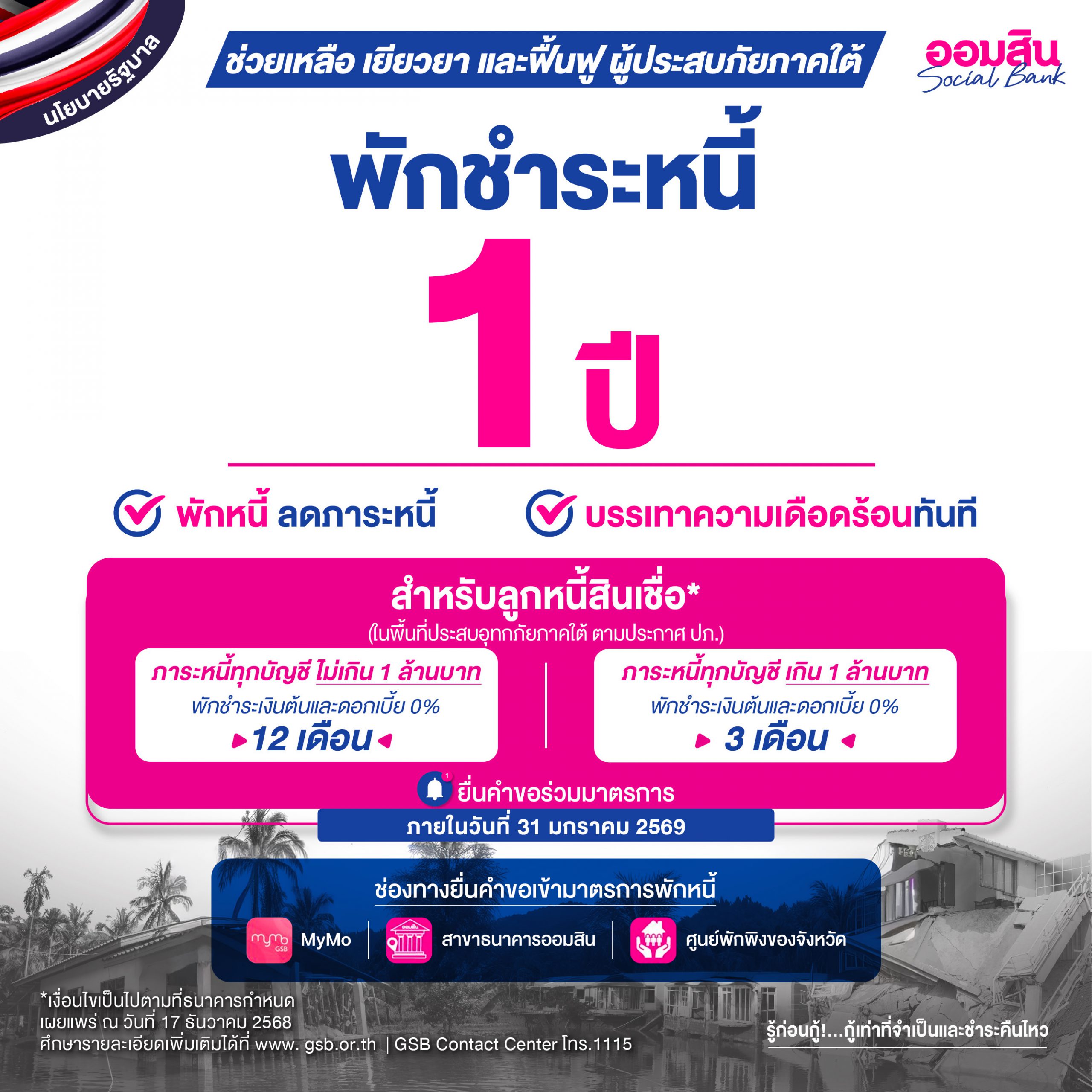 17 ธันวาคม 2568 : นางลภาวรรณ จันทร์กระจ่าง รองผู้อำนวยการธนาคารออมสิน รักษาการแทนผู้อำนวยการธนาคารออมสิน เปิดเผยว่า ตามมติคณะรัฐมนตรีเมื่อวันที่ 2 ธันวาคม 2568 เห็นชอบให้กระทรวงการคลังและสถาบันการเงินเฉพาะกิจเร่งออกมาตรการช่วยเหลือ เยียวยา ฟื้นฟูประชาชนที่ได้รับความเดือดร้อนจากอุทกภัยในพื้นที่ภาคใต้ตามประกาศของกรมป้องกันและบรรเทาสาธารณภัย (ปภ.) ธนาคารออมสินได้ออกชุดมาตรการทางการเงินที่ครอบคลุม กลุ่มลูกค้าเดิมและลูกค้าใหม่ ประกอบด้วย มาตรการพักชำระเงินต้นและไม่คิดดอกเบี้ย นาน 12 เดือน สำหรับลูกหนี้ที่มียอดหนี้ไม่เกิน 1 ล้านบาท ตามนโยบายรัฐ และจัดมาตรการเพิ่มเติมให้พักชำระเงินต้นและไม่คิดดอกเบี้ย นาน 3 เดือน สำหรับกลุ่มที่มียอดหนี้เกิน 1 ล้านบาท เพื่อหยุดภาระหนี้ทันทีในช่วงที่ยังต้องฟื้นฟูการดำรงชีพ