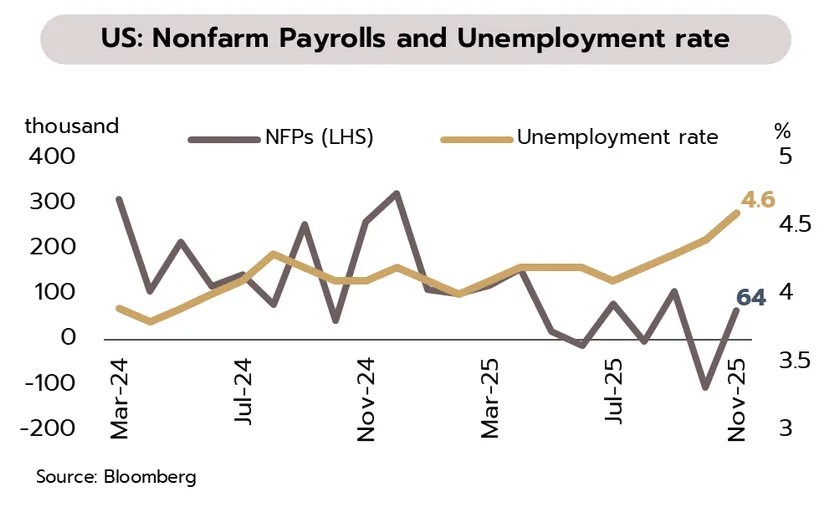 แรงส่งของเศรษฐกิจจีนอ่อนกำลังลงต่อเนื่อง โดยยอดค้าปลีกสินค้าขยายตัวเพียง 1.3% YoY ในเดือนพฤศจิกายน ซึ่งต่ำสุดเป็นประวัติการณ์ (หากไม่รวมช่วงโควิด) และการลงทุนในสินทรัพย์ถาวรหดตัวเร่งขึ้นจาก -1.7% ในช่วง 10 เดือนแรกเป็น -2.6% ในช่วง 11 เดือนแรก ขณะที่ราคาบ้านใหม่และบ้านมือสองในเดือนพฤศจิกายนหดตัวต่อเนื่องที่ -2.8% และ -5.7% ตามลำดับ นอกจากนี้ วิกฤตภาคอสังหาริมทรัพย์ยังเสี่ยงลุกลามไปยังภาคการเงินภายหลังธนาคารเงาเริ่มมีการผิดนัดชำระเงิน ด้านรัฐบาลประกาศแผนออกพันธบัตรรัฐบาลระยะยาวในปี 2569 เพื่ออุดหนุนมาตรการแลกซื้อสินค้าใหม่ และมาตรการปรับเปลี่ยนเครื่องจักรและอุปกรณ์