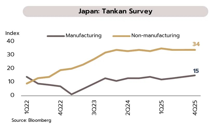 เศรษฐกิจญี่ปุ่นเริ่มเห็นพัฒนาการเชิงบวกมากขึ้นจาก (i) ความเชื่อมั่นของกลุ่มผู้ประกอบการขนาดใหญ่ที่เพิ่มขึ้นอย่างชัดเจน (ii) PMI ภาคบริการที่ยังขยายตัวอย่างแข็งแกร่ง (iii) ภาคท่องเที่ยวที่เติบโต และ (iv) ยอดส่งออกที่ฟื้นตัวต่อเนื่องเป็นเดือนที่ 2 นอกจากนี้ มาตรการกระตุ้นทางการคลังรวมถึงแผนการปรับขึ้นค่าจ้างแรงงานคาดว่าจะเป็นอีกปัจจัยที่ช่วยหนุนการฟื้นตัวของเศรษฐกิจญี่ปุ่นในระยะข้างหน้า ทั้งนี้ วิจัยกรุงศรีประเมินว่าหากพัฒนาการของเศรษฐกิจยังอยู่ในเชิงบวกและมีความเสี่ยงเงินเฟ้อที่ล่าสุดยังคงค้างอยู่ที่ระดับ 2.7-3.0% BOJ อาจทยอยปรับขึ้นอัตราดอกเบี้ยนโยบายอย่างค่อยเป็นค่อยไปในปี 2569