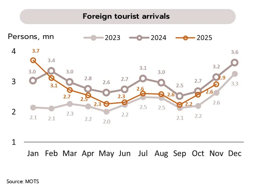 ภาคท่องเที่ยวทยอยฟื้นตัวอย่างช้าๆ คาดนักท่องเที่ยวต่างชาติปี 2569 เพิ่มขึ้นเป็น 35.5 ล้านคน ในเดือนพฤศจิกายน จำนวนนักท่องเที่ยวต่างชาติที่เดินทางเข้าไทยอยู่ที่ 2.91 ล้านคน หดตัว -7.5% YoY ส่งผลให้ในช่วง 11 เดือนแรกของปี 2568 มีนักท่องเที่ยวต่างชาติรวม 29.6 ล้านคน หดตัว -7.3% ขณะที่ข้อมูลล่าสุดในช่วงวันที่ 1–14 ธันวาคม มีนักท่องเที่ยวต่างชาติอีก 1.37 ล้านคน ทำให้ยอดสะสมตั้งแต่ต้นปีเพิ่มขึ้นเป็น 31.0 ล้านคน ทั้งนี้ ยังคงต้องติดตามการฟื้นตัวในช่วงครึ่งหลังของเดือนธันวาคมอย่างใกล้ชิด โดยมีความเสี่ยงที่จำนวนนักท่องเที่ยวต่างชาติทั้งปี 2568 อาจออกมาต่ำกว่าประมาณการของวิจัยกรุงศรีที่ 33.3 ล้านคน