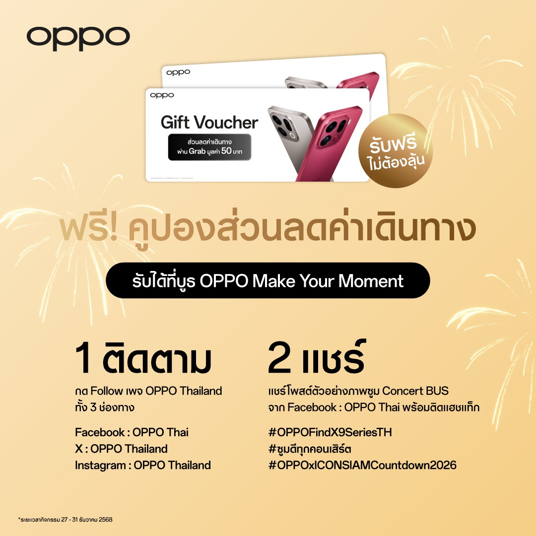 เตรียมพบกับกิจกรรมสุดพิเศษจาก OPPO ห้ามพลาดกับการเก็บภาพโมเมนต์อันน่าประทับใจ และพบกับมหาปรากฏการณ์เฉลิมฉลองส่งท้ายปีที่ยิ่งใหญ่ที่สุดของไทย Amazing Thailand Countdown 2026 มหาปรากฏการณ์เคานต์ดาวน์ ผนึกกำลังสุดยิ่งใหญ่ สุดยอดประสบการณ์เหนือความคาดหมาย ระหว่างวันที่ 27-31 ธันวาคม 2568 นี้ ณ ริเวอร์ พาร์ค ไอคอนสยาม เท่านั้น!