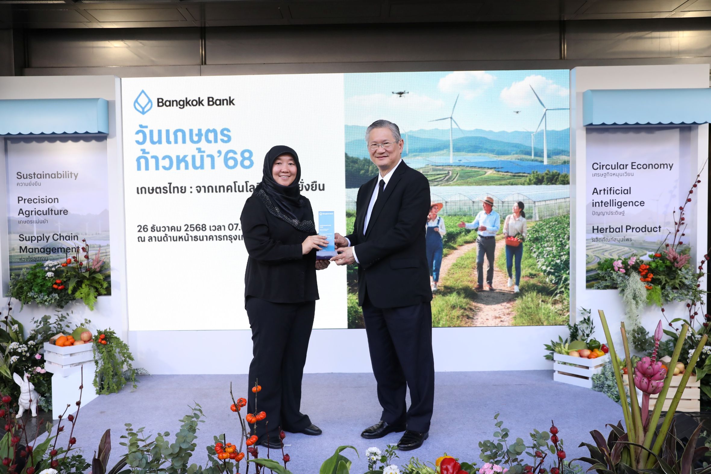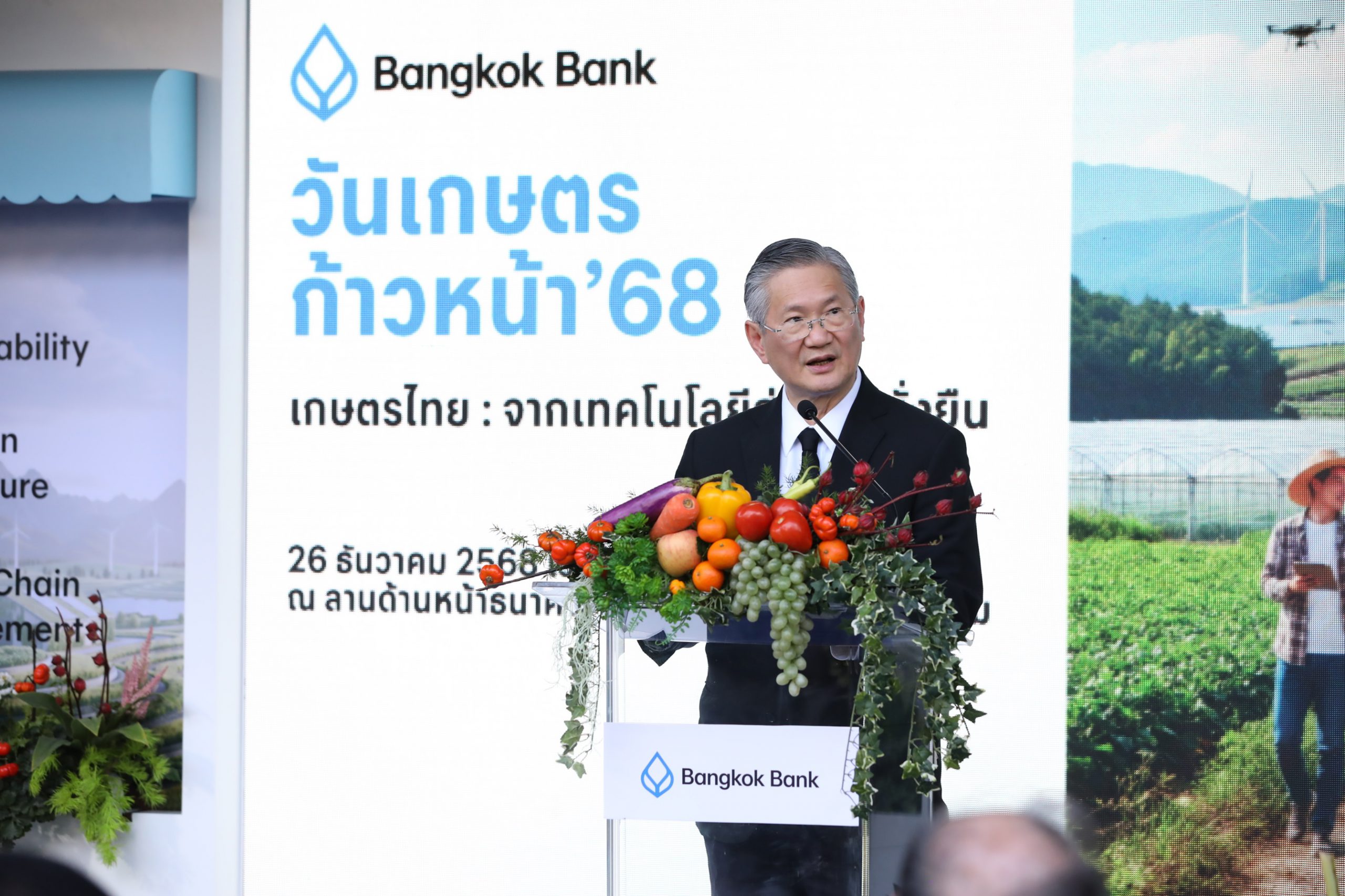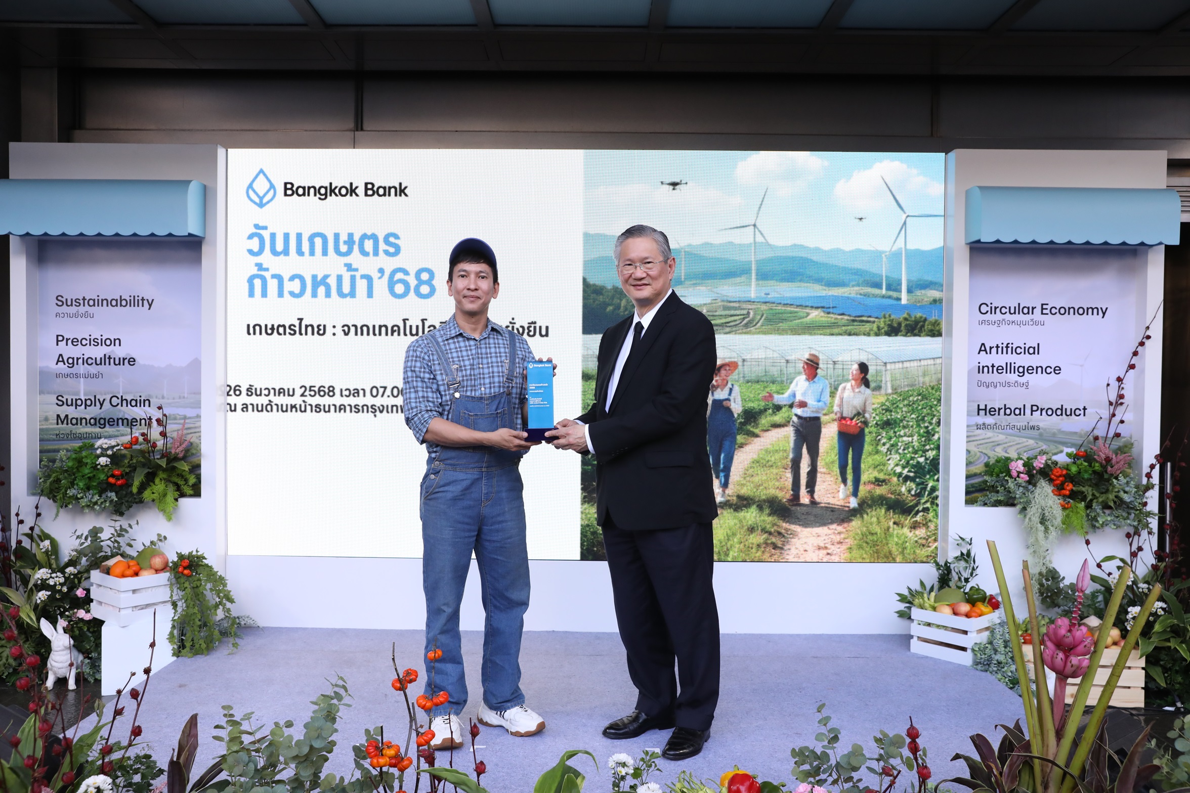 26 ธันวาคม 2568 : ธนาคารกรุงเทพ ธนาคารกรุงเทพ จำกัด (มหาชน) นำโดย สิงห์ ตังทัตสวัสดิ์ ประธานกรรมการบริหาร, ชาติศิริ โสภณพนิช กรรมการผู้จัดการใหญ่, อมร จันทรสมบูรณ์ กรรมการธนาคาร, พิเชฐ ดุรงคเวโรจน์ กรรมการบริหาร และกอบศักดิ์ ภูตระกูล กรรมการรองผู้จัดการใหญ่ ส่งท้ายปีด้วยมหกรรมครั้งสำคัญ งานประจำปี “วันเกษตรก้าวหน้า’ 68” ครั้งที่ 18 ภายใต้แนวคิด “เกษตรไทย : จากเทคโนโลยีสู่ความยั่งยืน” ขนทัพสินค้าเกษตรคุณภาพส่งออกมาให้เลือกช็อปเป็นของขวัญปีใหม่ ในราคาพิเศษ จาก 58 ผู้ประกอบการ พร้อมมอบรางวัล 3 เกษตรกรไทยดีเด่น จัดเต็มความรู้ผ่านงานสัมมนา เตรียมความพร้อมเกษตรกรรับมือผลกระทบจากความเปลี่ยนแปลงทางการค้าโลกและอัปเดตข้อมูลเทคโนโลยี-นวัตกรรมสมัยใหม่ ณ ธนาคารกรุงเทพ สำนักงานใหญ่ สีลม