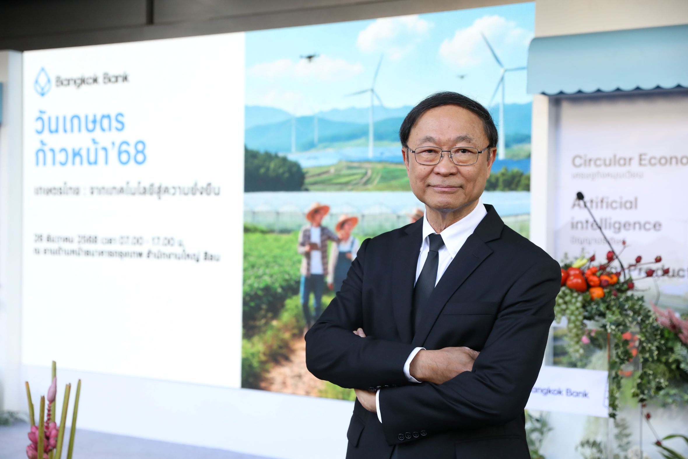พิเชฐ ดุรงคเวโรจน์ กรรมการบริหาร ธนาคารกรุงเทพ จำกัด (มหาชน) กล่าวว่า ธนาคารกรุงเทพ มุ่งมั่นสนับสนุน และผลักดันภาคการเกษตรไทยอย่างต่อเนื่องตลอดระยะเวลากว่า 81 ปี ซึ่งงานมหกรรมจำหน่ายสินค้า วันเกษตรก้าวหน้า’ 68 นี้ จัดขึ้นเพื่อยืนยันเจตนารมณ์ของธนาคารที่จะเป็น “เพื่อนคู่คิด มิตรคู่บ้าน” สนับสนุนและอยู่เคียงข้างให้เกษตรกรไทยสามารถพัฒนาอย่างยั่งยืน พร้อมทั้งเปิดโอกาสให้ภาคเกษตรไทยได้ก้าวสู่เวทีโลกอย่างมั่นคง ด้วยองค์ความรู้ที่ทันสมัย โดยให้ความสำคัญกับประเด็น การเพิ่มผลผลิตและลดความเสี่ยงด้วยเกษตรแม่นยำ (Precision Agriculture) ซึ่งสามารถช่วยลดต้นทุนปุ๋ยและยาได้ 15–40% และเพิ่มผลผลิตได้ถึง 10–30% การพัฒนาคุณภาพผลผลิตให้ได้มาตรฐานสากล เช่น มาตรฐาน GAP Organic Carbon footprint การแปรรูปนวัตกรรม (Agro-processing Innovation) เช่น ถนอมอาหารด้วยนวัตกรรม Food Tech